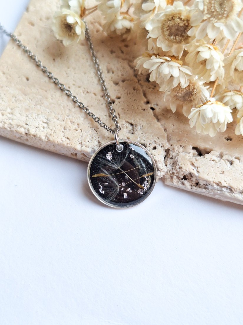 Uroczy wisiorek z zatopionymi nasionami dmuchawca i płatkami srebra na czarnym, połyskującym tle. Wykonany z wysokiej klasy żywicy, która nie zmienia koloru pod wpływem promieniowania uv oraz wysokiej jakości stali chirurgicznej.