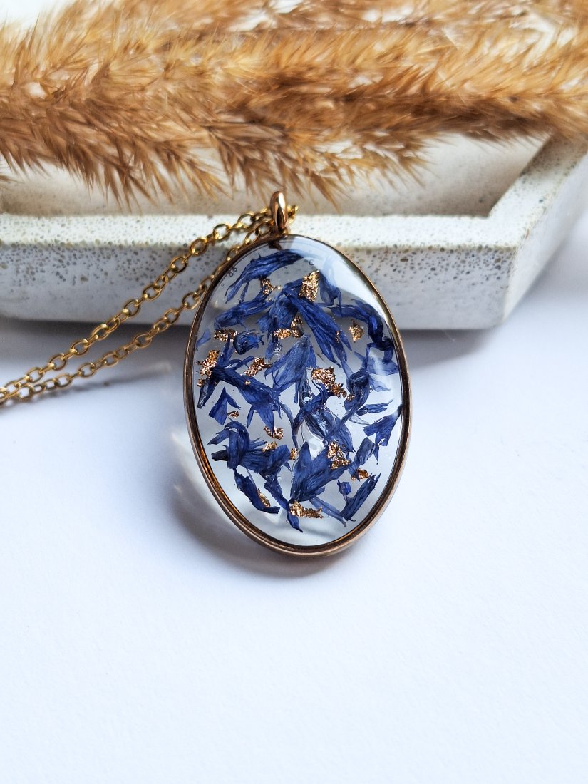 Uroczy wisiorek z zatopionymi płatkami chabra i płatkami złota. Wykonany z wysokiej klasy żywicy, która nie zmienia koloru pod wpływem promieniowania uv oraz wysokiej jakości stali chirurgicznej.