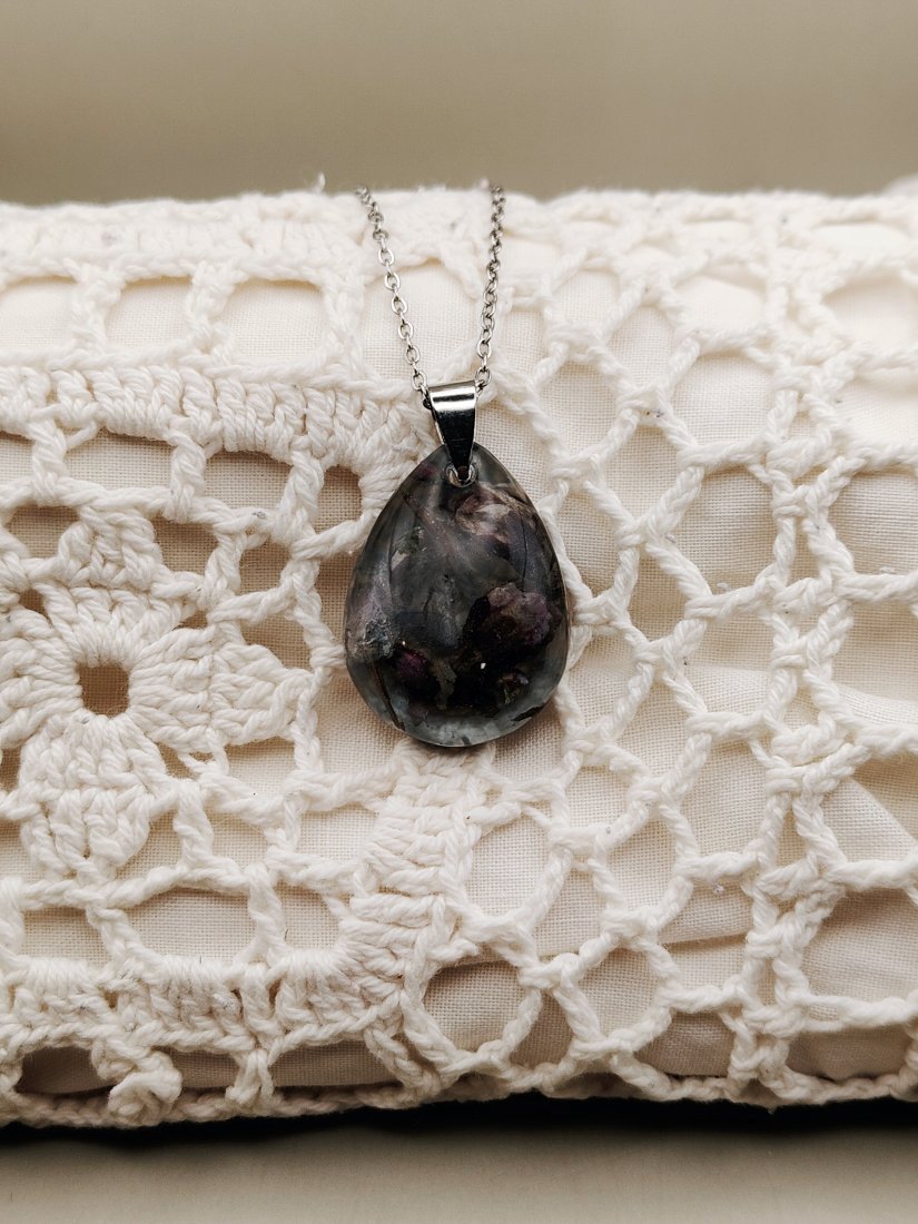 Elegancki wisiorek wykonany z przejrzystej żywicy, wewnątrz której zatopiono delikatne, naturalne kwiaty w odcieniach fioletu, różu i zieleni. Tworzą one subtelną, tajemniczą kompozycję przypominającą nocny ogród. Kropla żywicy osadzona jest na minimalistycznej, metalowej zawieszce i zawieszona na srebrzystym łańcuszku. Biżuteria idealna dla osób ceniących naturę, unikalne rękodzieło oraz niepowtarzalne dodatki.