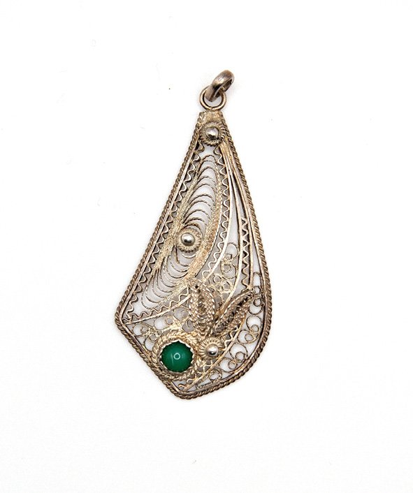 Niewielki, misterny wisiorek - zawieszka. Wykonany ze srebra (próba bodajże 925 - częściowo zatarta). Ciekawy wzór kwiatowy z niewielkim, zielonym kamieniem półszlachetnym - chyba chryzoprasem.