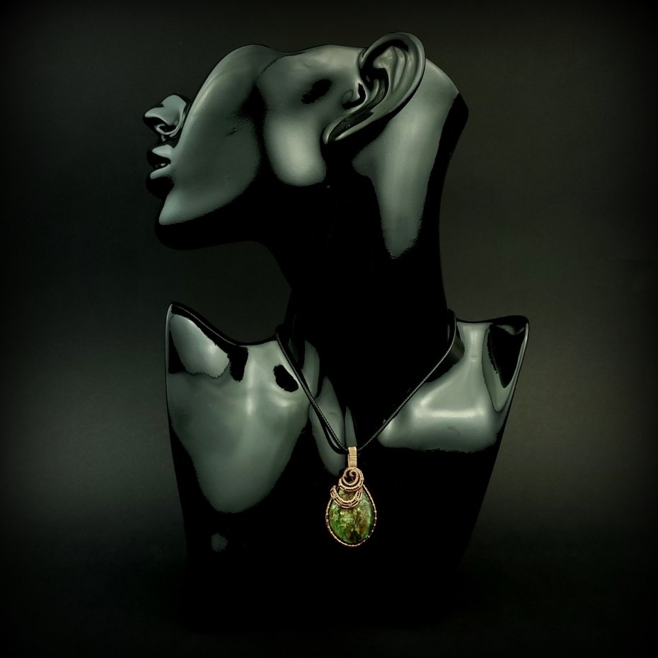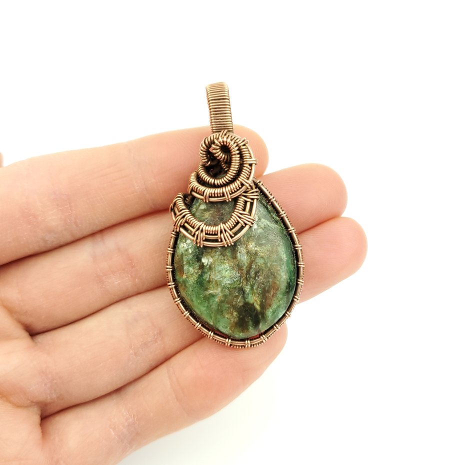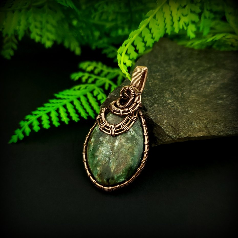 Wisiorek powstał z naturalnego szmaragdu, który został misternie opleciony miedzią.