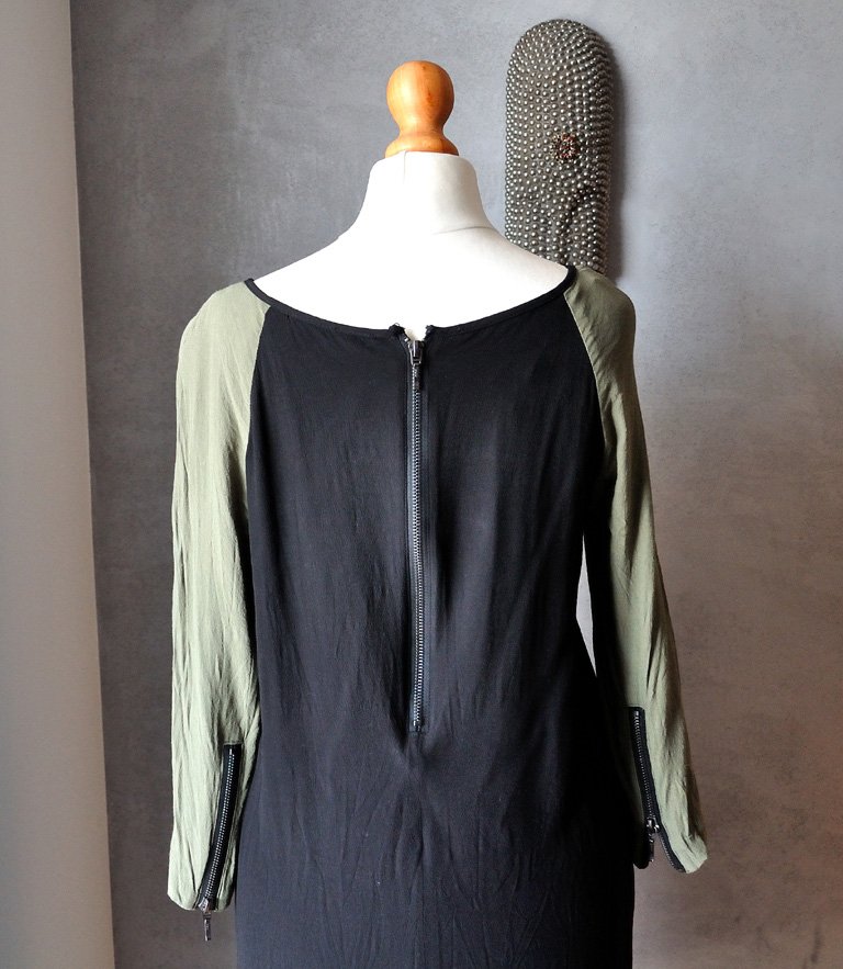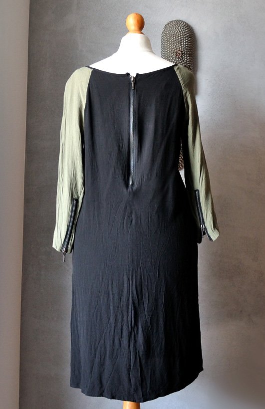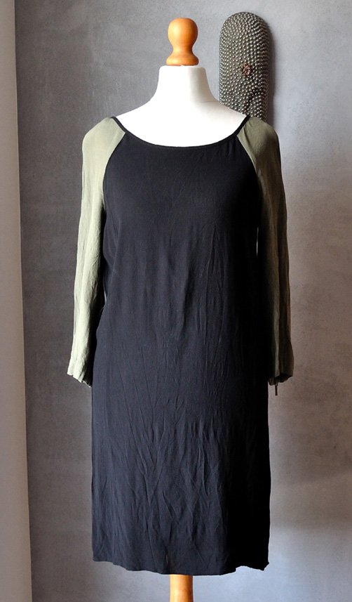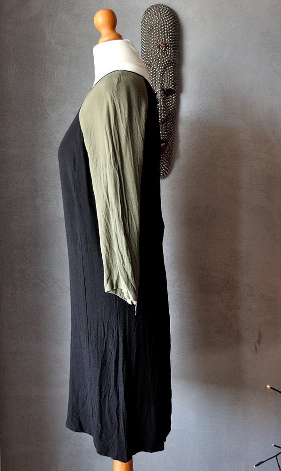 Fason prosty, nie jest obcisła. Rękawy krótsze, uszyte z kontrastującego z czernią głównej tkaniny, oliwkowego materiału.