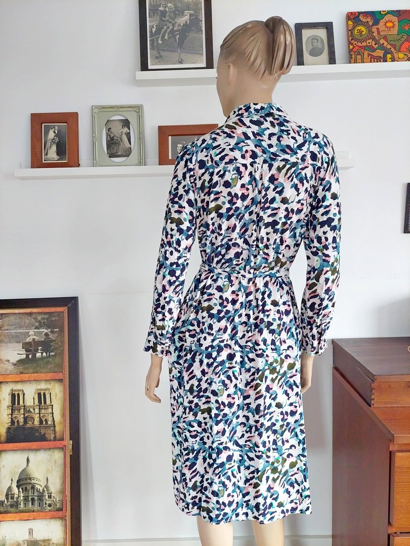sukienka marki s.Oliver, zapinana na małe guziczki w bardzo dobrym stanie. fason prosty z paskiem, z kieszeniami do wewnątrz. rękaw można podwijać. rozmiar z metki brak, proszę sprawdzić wymiary. na manekinie małe 38, materiał 100% wiskoza.