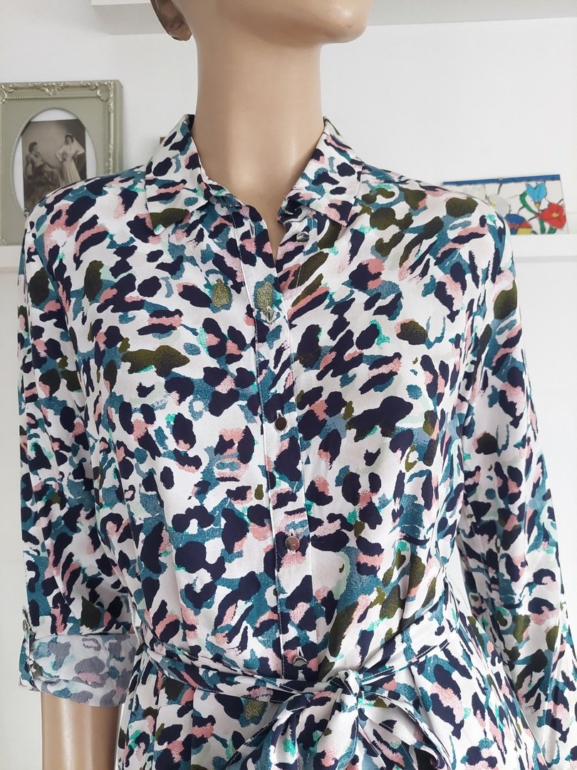 sukienka marki s.Oliver, zapinana na małe guziczki w bardzo dobrym stanie. fason prosty z paskiem, z kieszeniami do wewnątrz. rękaw można podwijać. rozmiar z metki brak, proszę sprawdzić wymiary. na manekinie małe 38, materiał 100% wiskoza.