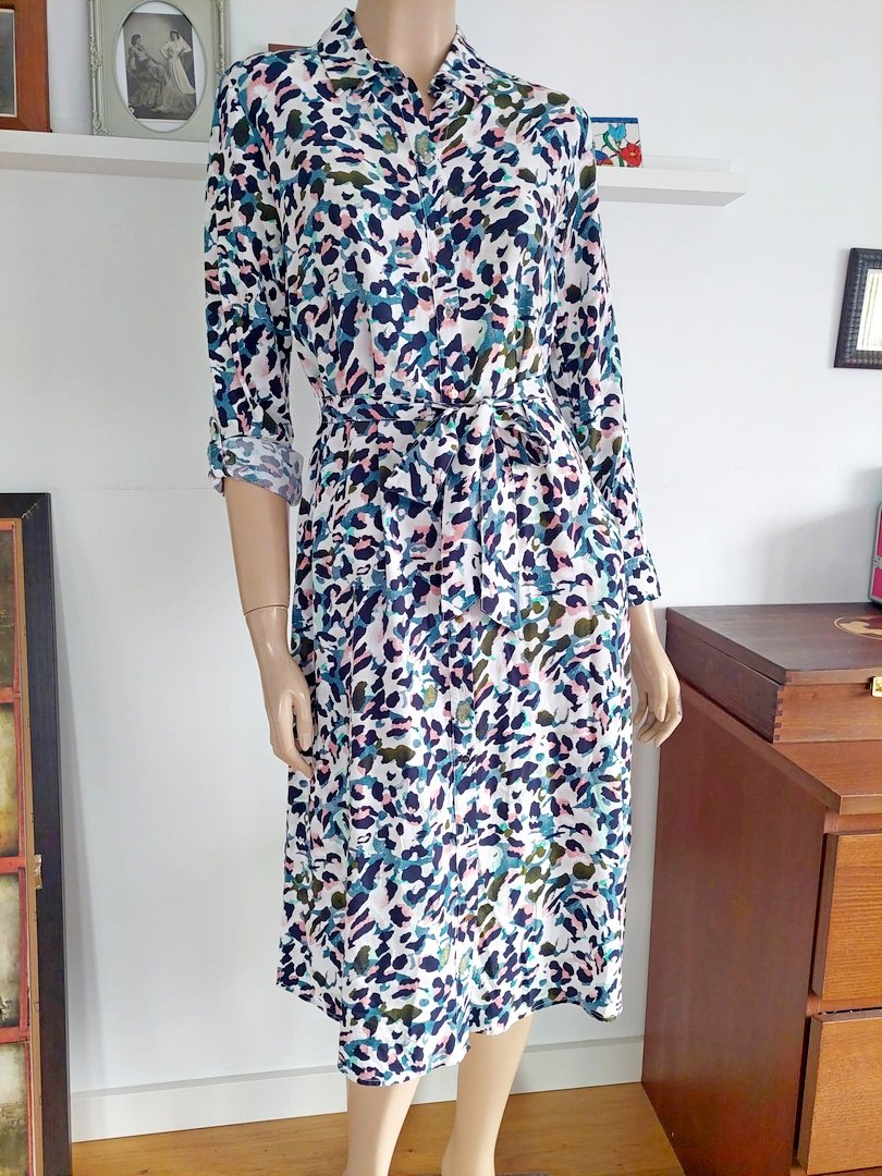 sukienka marki s.Oliver, zapinana na małe guziczki w bardzo dobrym stanie. fason prosty z paskiem, z kieszeniami do wewnątrz. rękaw można podwijać. rozmiar z metki brak, proszę sprawdzić wymiary. na manekinie małe 38, materiał 100% wiskoza.