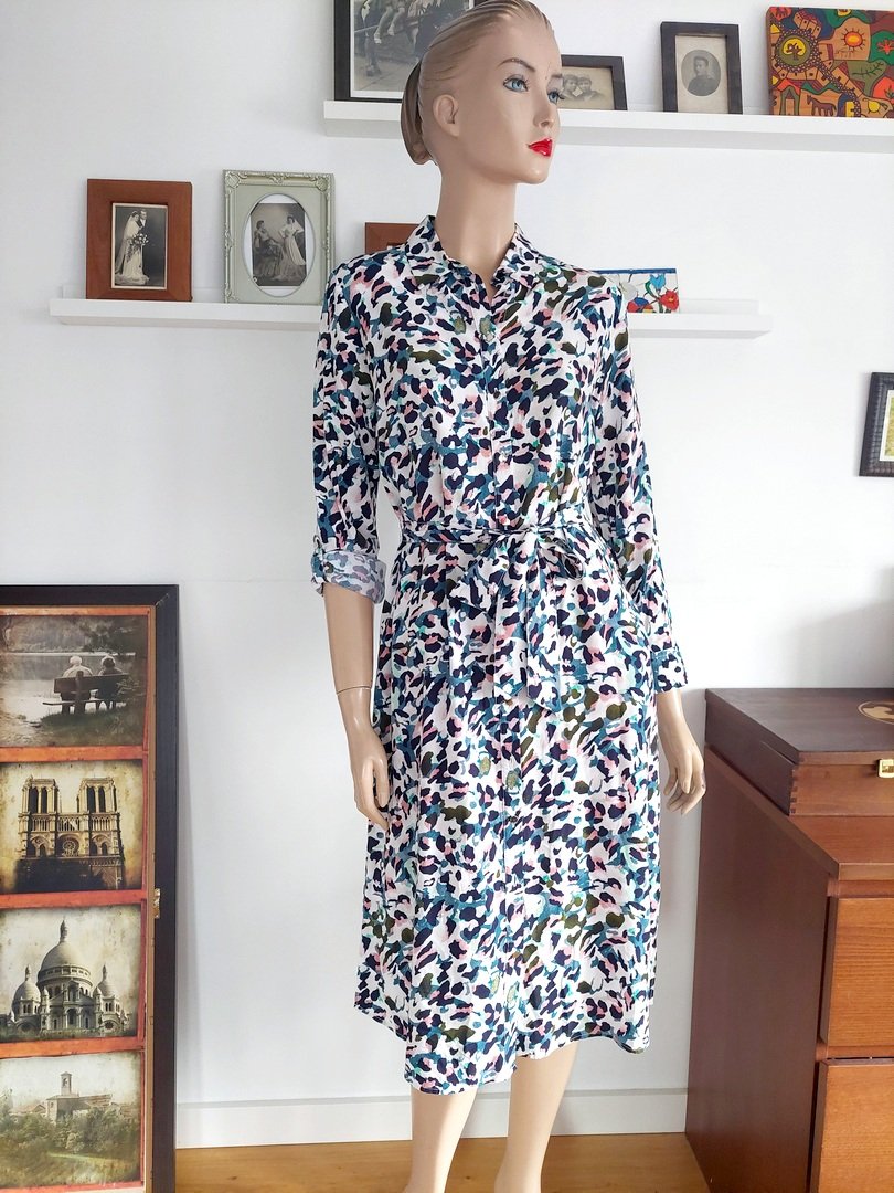 sukienka marki s.Oliver, zapinana na małe guziczki w bardzo dobrym stanie. fason prosty z paskiem, z kieszeniami do wewnątrz. rękaw można podwijać. rozmiar z metki brak, proszę sprawdzić wymiary. na manekinie małe 38, materiał 100% wiskoza.