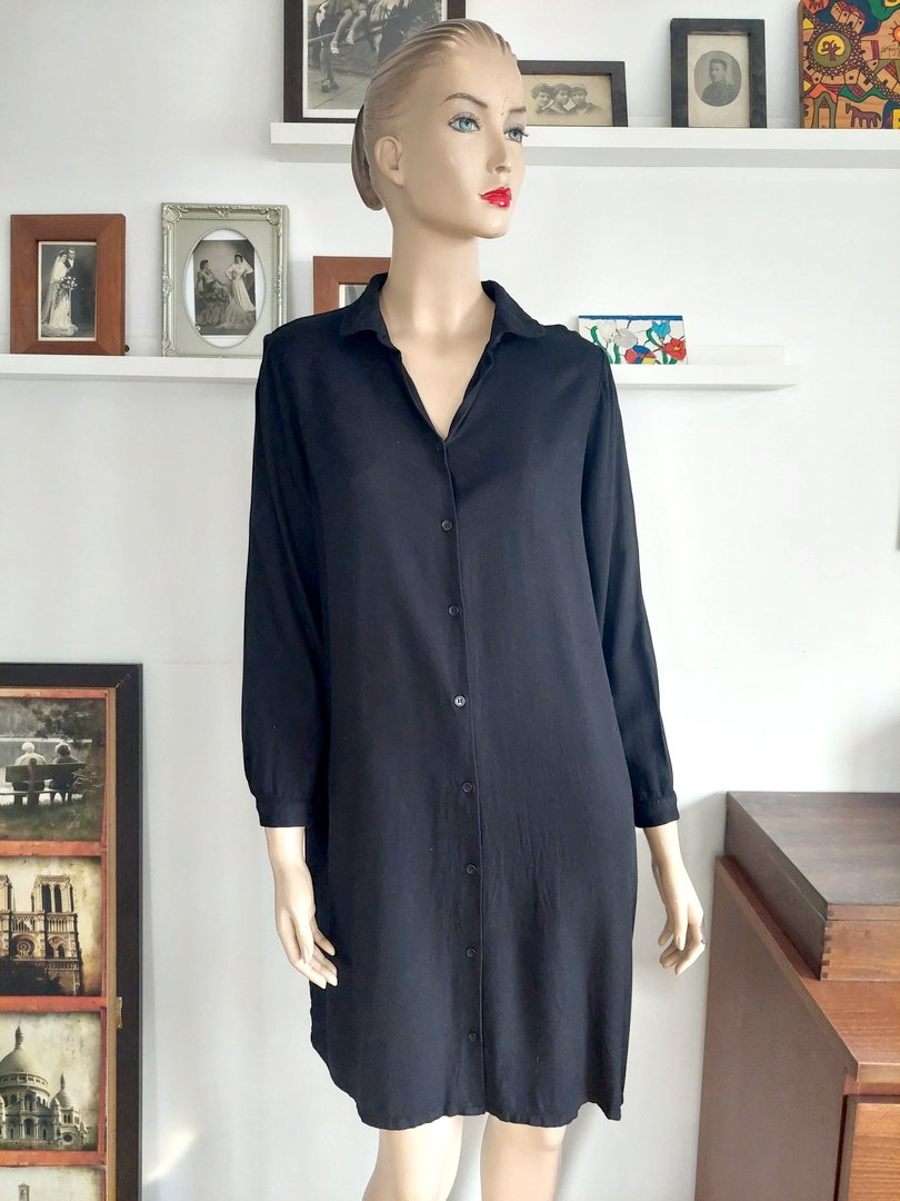 sukienka marki Monki, zapinana na małe guziczki. szeroki fason z zakładkami z tyłu i z kieszeniami do wewnątrz. rozmiar z metki s, ale to duży rozmiar proszę sprawdzić wymiary. na manekinie małe 38, materiał 100% wiskoza. kolor czarny. w bardzo dobrym stanie