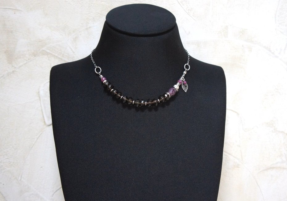 Naszyjnik wykonany ze srebra [pr.925] w połączeniu z oponkami fasetowanymi kwarcu dymnego [10mm], kuleczkami fasetowanymi rubinów [6mm] oraz dużą, fasetowaną oponką rubinu [14mm]. Całość oksydowana i przetarta. Całkowita długość naszyjnika ok. 43,5cm plus przedłużka . Biżuteria ozdobnie zapakowana.