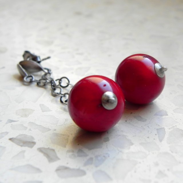 Kolczyki wykonane zostały ze srebra próby 925, oksydowanego i przetartego oraz kul korala robaczywki (14 mm)
