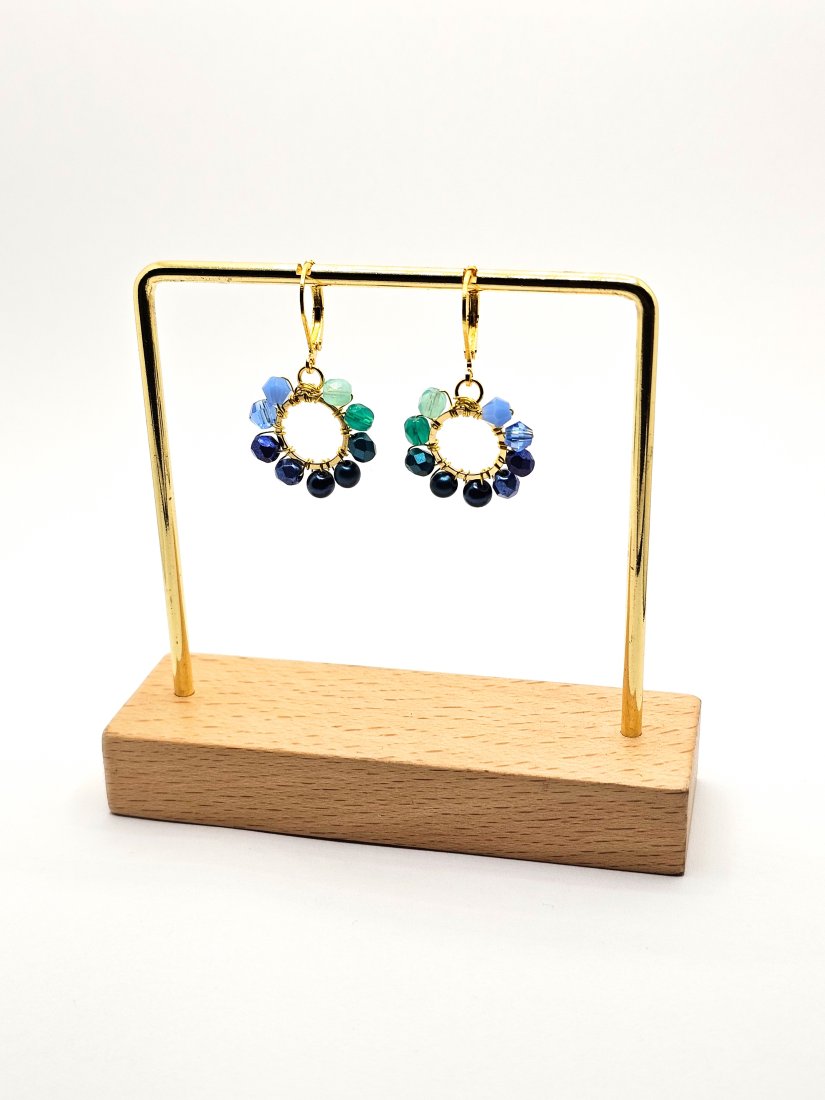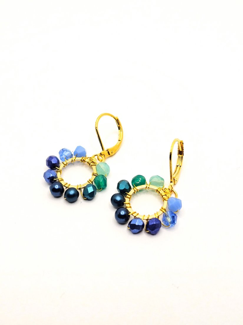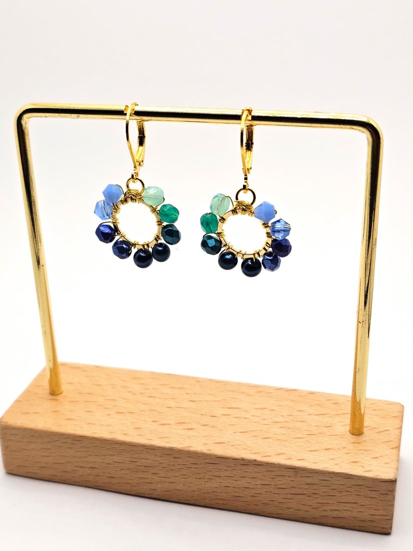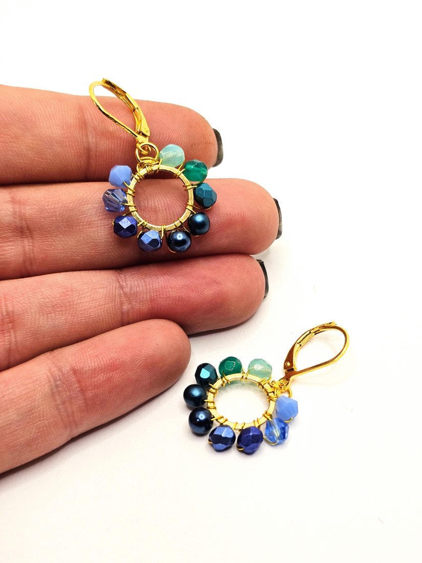 Wiszące kolczyki z szklanymi koralikami i kryształkami. Metalowa baza opleciona kolorowymi koralikami. Kolory w kolczykach: złoty, niebieski granatowy, turkusowy, morski. Kolczyki zawieszone na biglach angielskich w kolorze złotym.