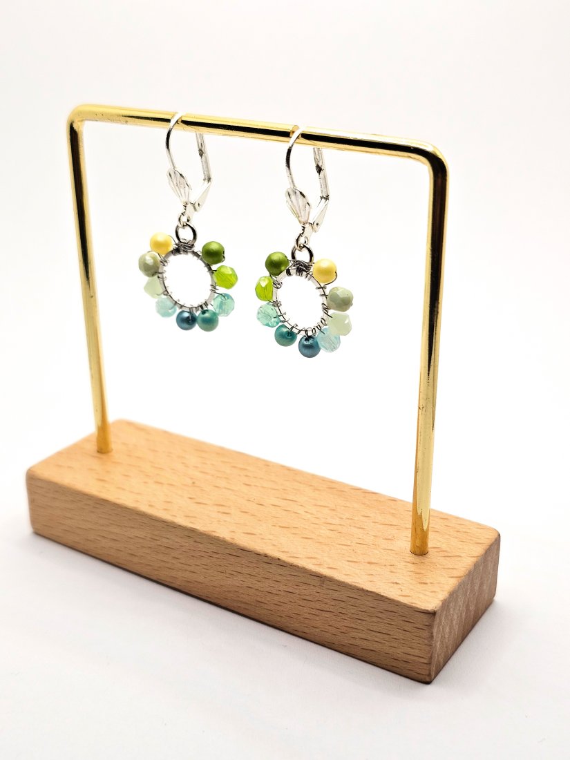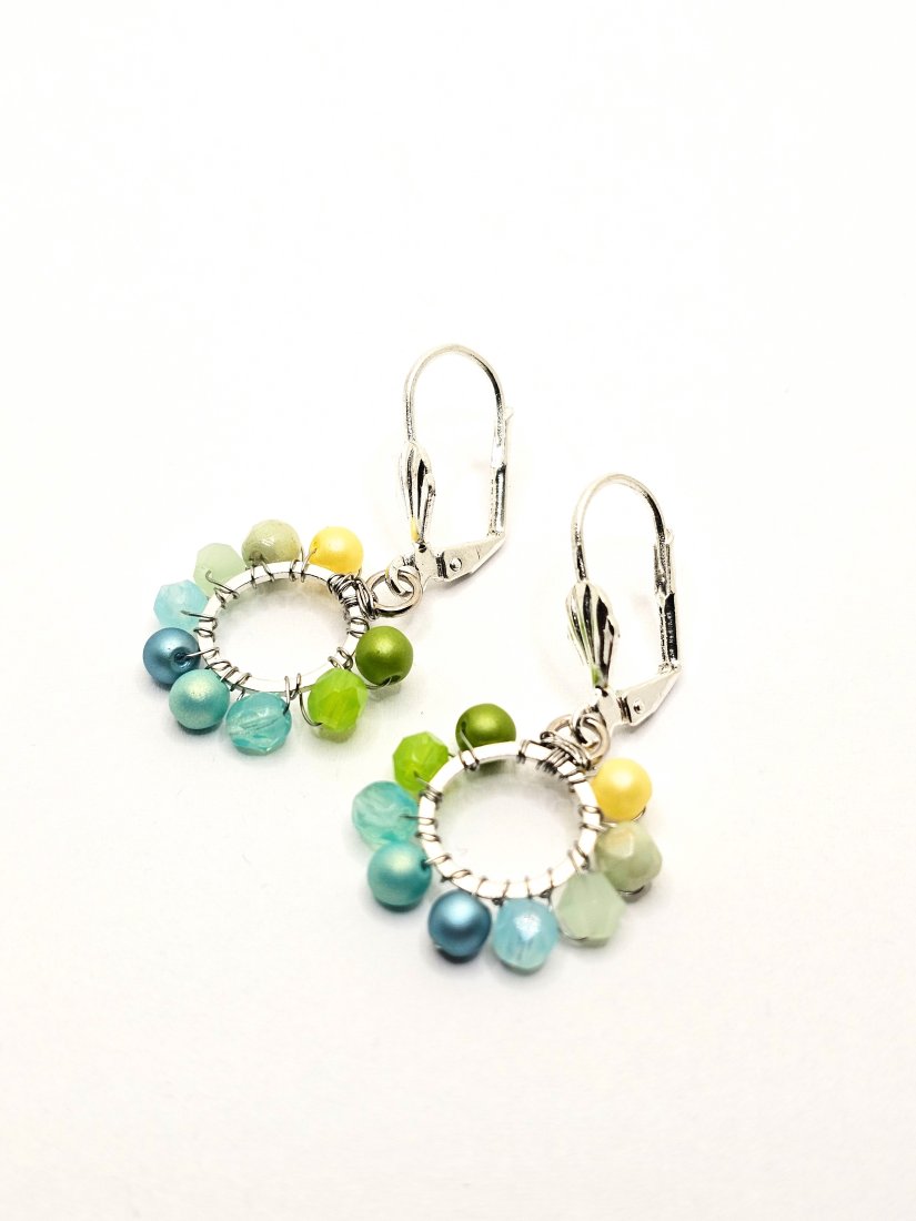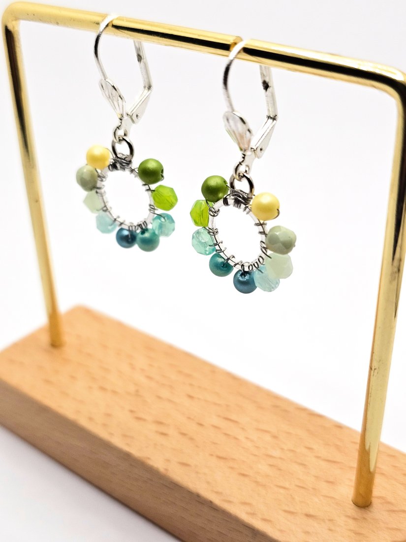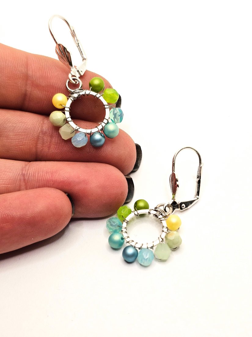 Wiszące kolczyki z szklanymi koralikami i kryształkami. Metalowa baza opleciona kolorowymi koralikami. Kolory w kolczykach: srebrny, limonkowy, miętowy, turkusowy, żółty . Kolczyki zawieszone na biglach angielskich w kolorze srebrnym.