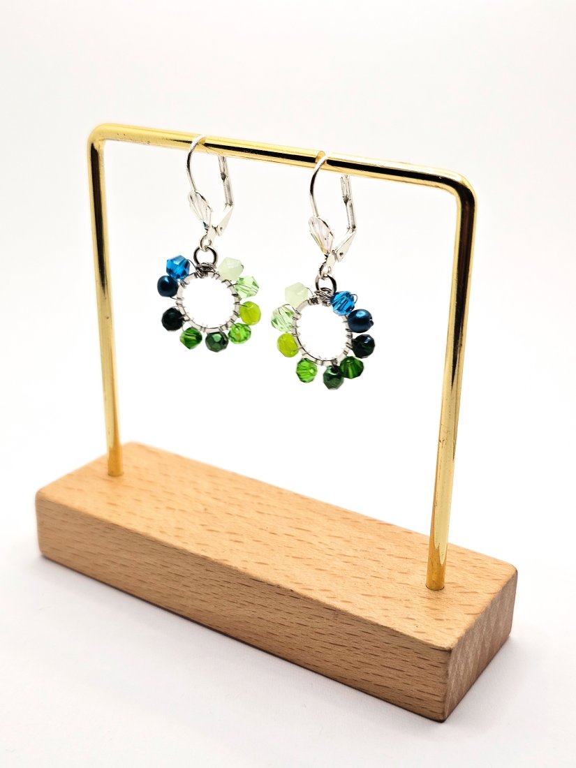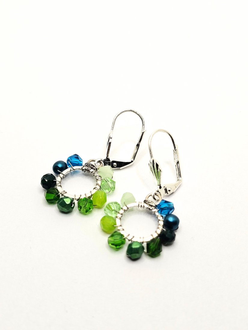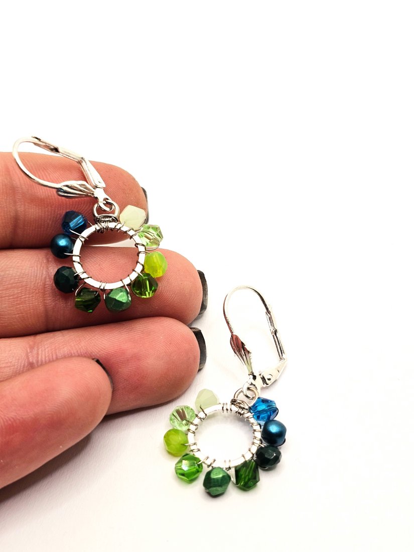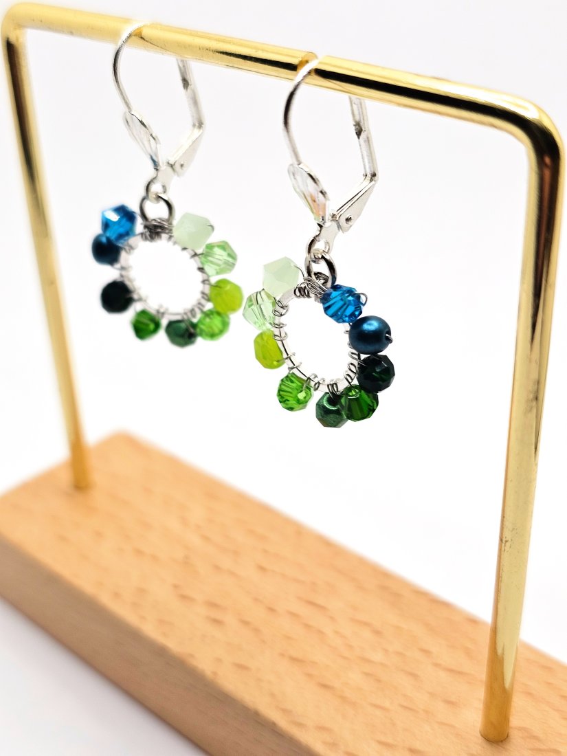 Wiszące kolczyki z szklanymi koralikami i kryształkami. Metalowa baza opleciona kolorowymi koralikami. Kolory w kolczykach: srebrny, zielony, niebieski. Kolczyki zawieszone na biglach angielskich w kolorze srebrnym.