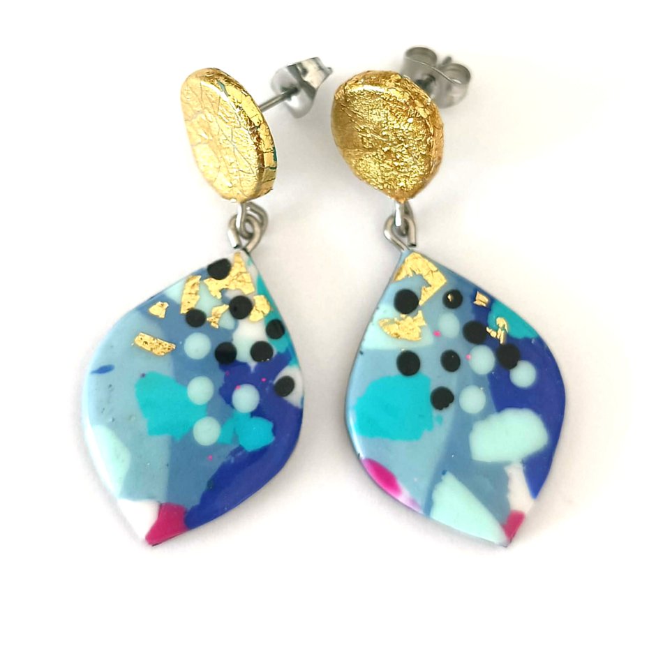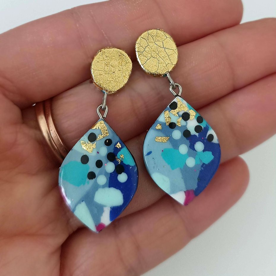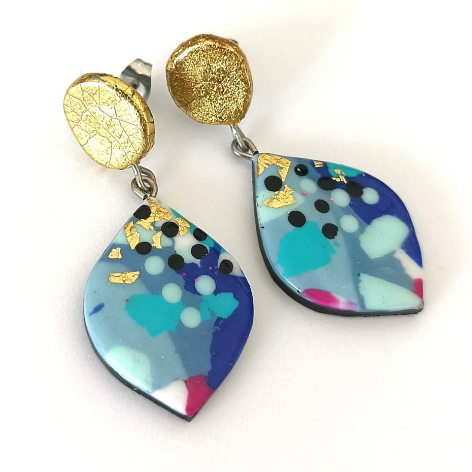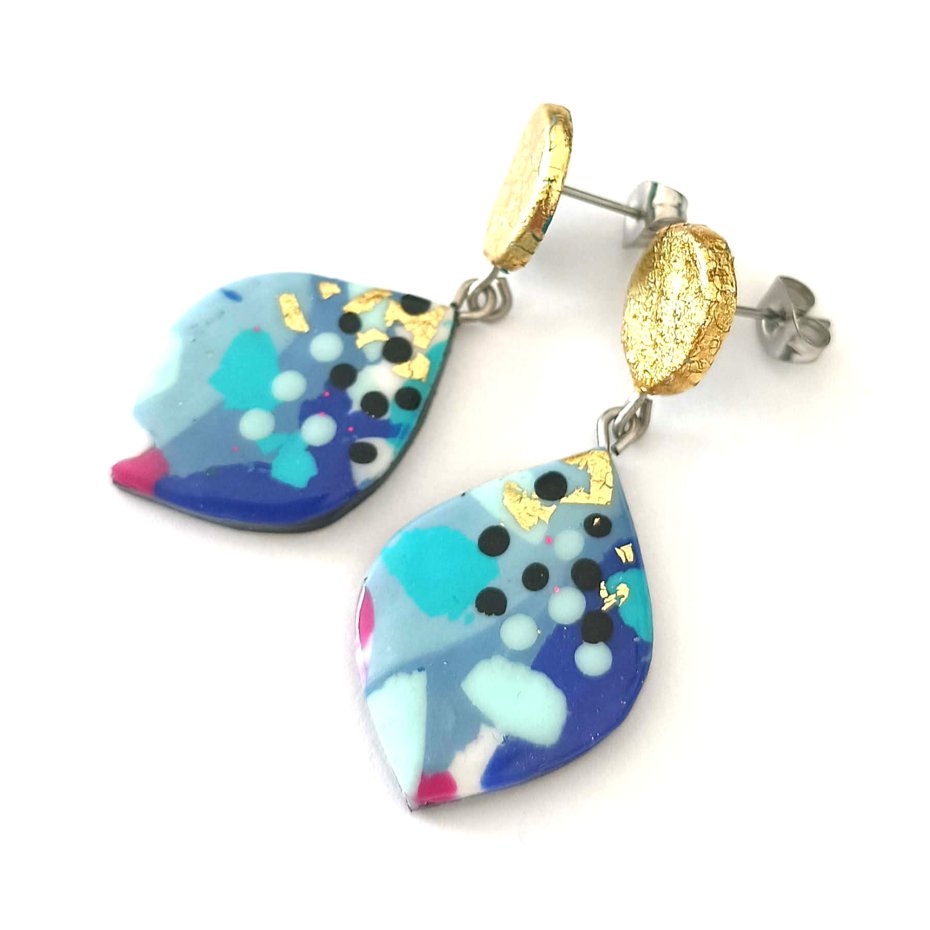 Te odważne i artystyczne kolczyki zostały wykonane ręcznie z glinki polimerowej i posiadają wzór inspirowany terrazzo w kolorach: niebieskim, złotym, miętowym, różowym i czarnym. Unikalny design nadaje im nowoczesny, abstrakcyjny wygląd, dzięki czemu są prawdziwym elementem przyciągającym uwagę.