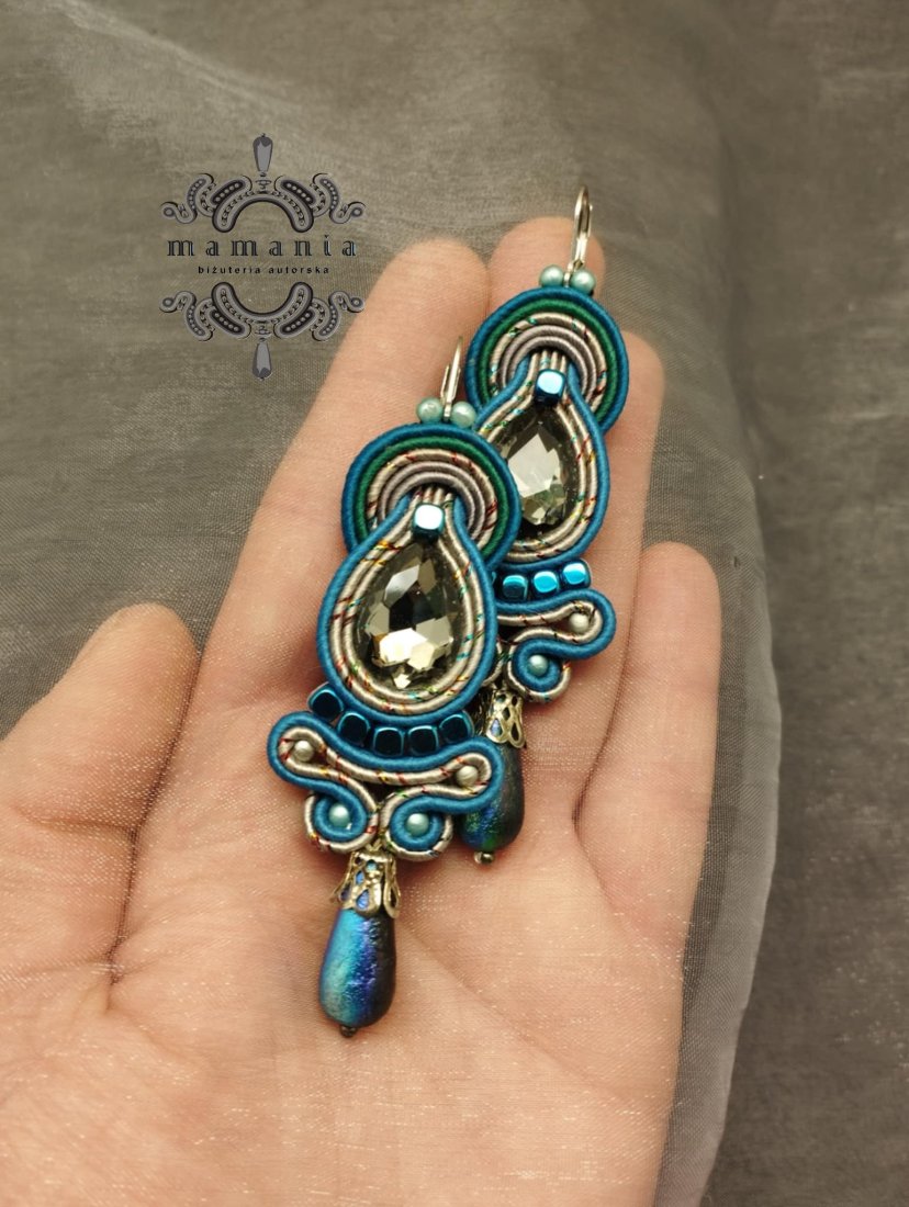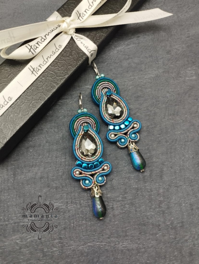 Kolczyki wykonane haftem sutaszowym, od podstaw ręcznie. Kolczyki są unikatami, wykonanymi tylko w jednym egzemplarzu. Subtelne, lekkie, smukłe, zadowolą każdą indywidualistkę, która ceni w biżuterii oryginalność. Sznureczek szarego sutaszu, z błyszczącą nitką, połączony z matową szarością i ciemnym turkusem oraz kosteczkami hematytu, szlifowaną, szklaną kroplą i matowymi kuleczkami, a wszystko zwieńczone opalizującą szklaną kroplą. Kolczyki sprawdzą się w wielu stylizacjach, przyciągając zaciekawione spojrzenia innych kobiet.