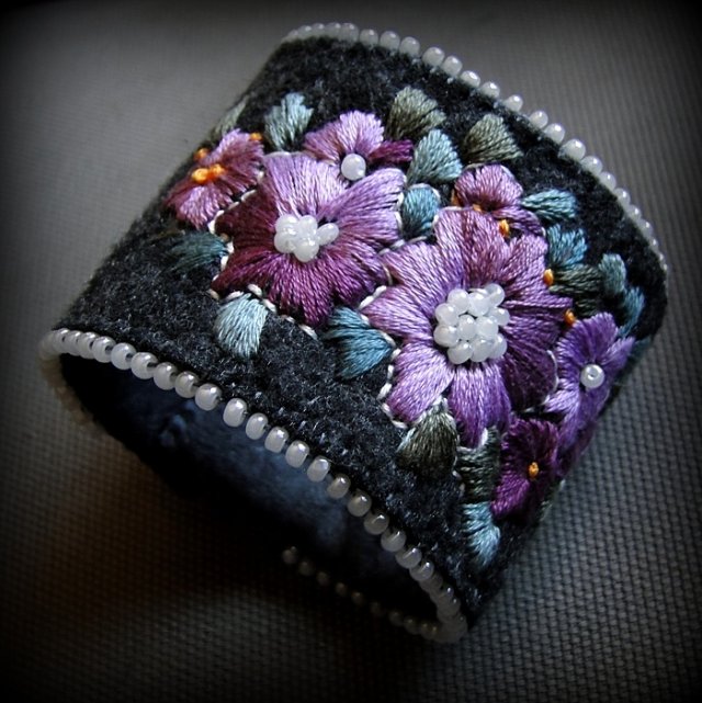 Przepiękna ( ładniejsza niż na zdjęciu), autorska bransoleta, szeroka, ozdobna, a lekka i wygodna. Wykonana ręcznie haftem płaskim - z wielką starannością. Bazę stanowi gruby, mięsisty, trwały filc, przyjemny w dotyku. Bardzo wygodne zapięcie: koralik i pętelka z gumki. Wymiary: szerokość ok. 5,5 - na nadgarstek 15-17 cm ( możliwość dokładnego wyregulowania poprzez przeszycie koralika). Polecam. Nietuzinkowy dodatek na każdą okazję.