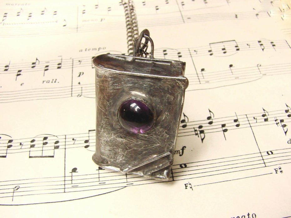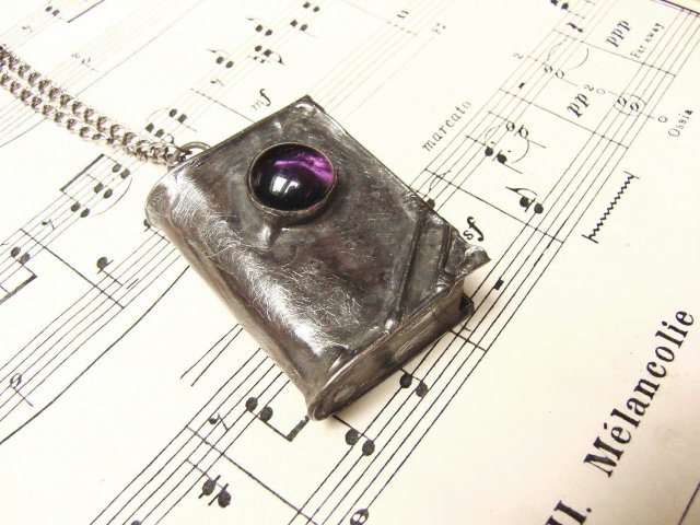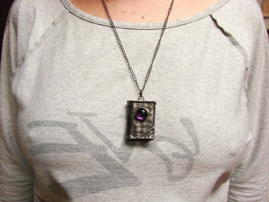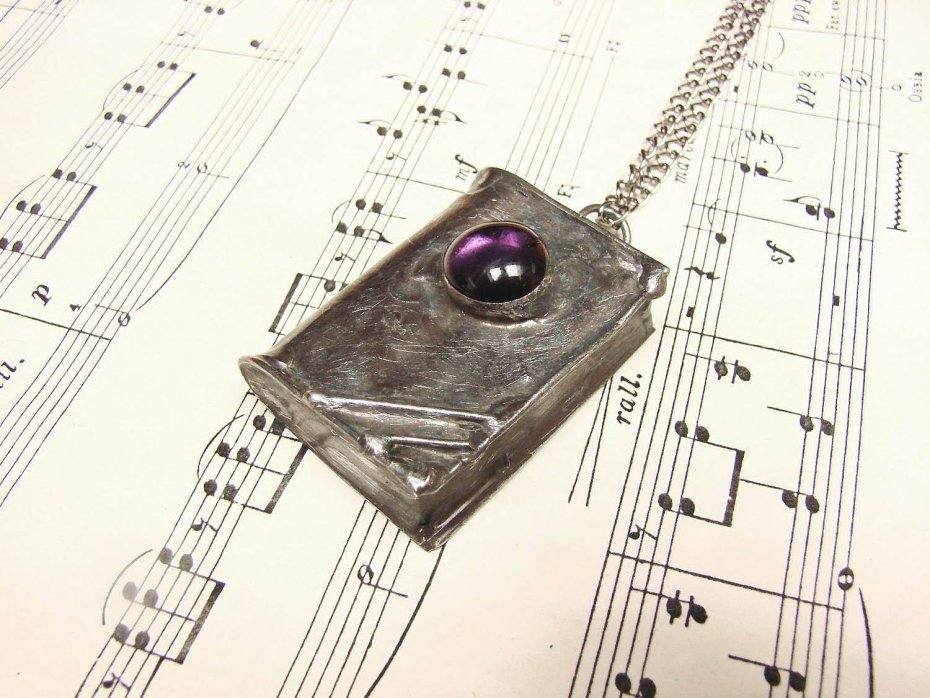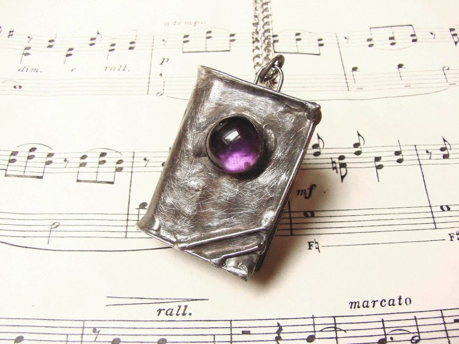 Wisior w kształcie książki wykonany z miedzi oprawiony stopem cyny i srebra ozdabiany delikatnym fioletowym kaboszonem . Całość patynowana na kolor starego srebra ręcznie przecierana i polerowana , zawieszona na 60 cm łańcuszku. Wymiary wisiora to 4,5 x 3 cm Jeśli życzą sobie Państwo inną dowolną długość łańcuszka proszę o informacje mailową po zakupie a bez problemu to zmienię. Zapraszam do zakupu ...