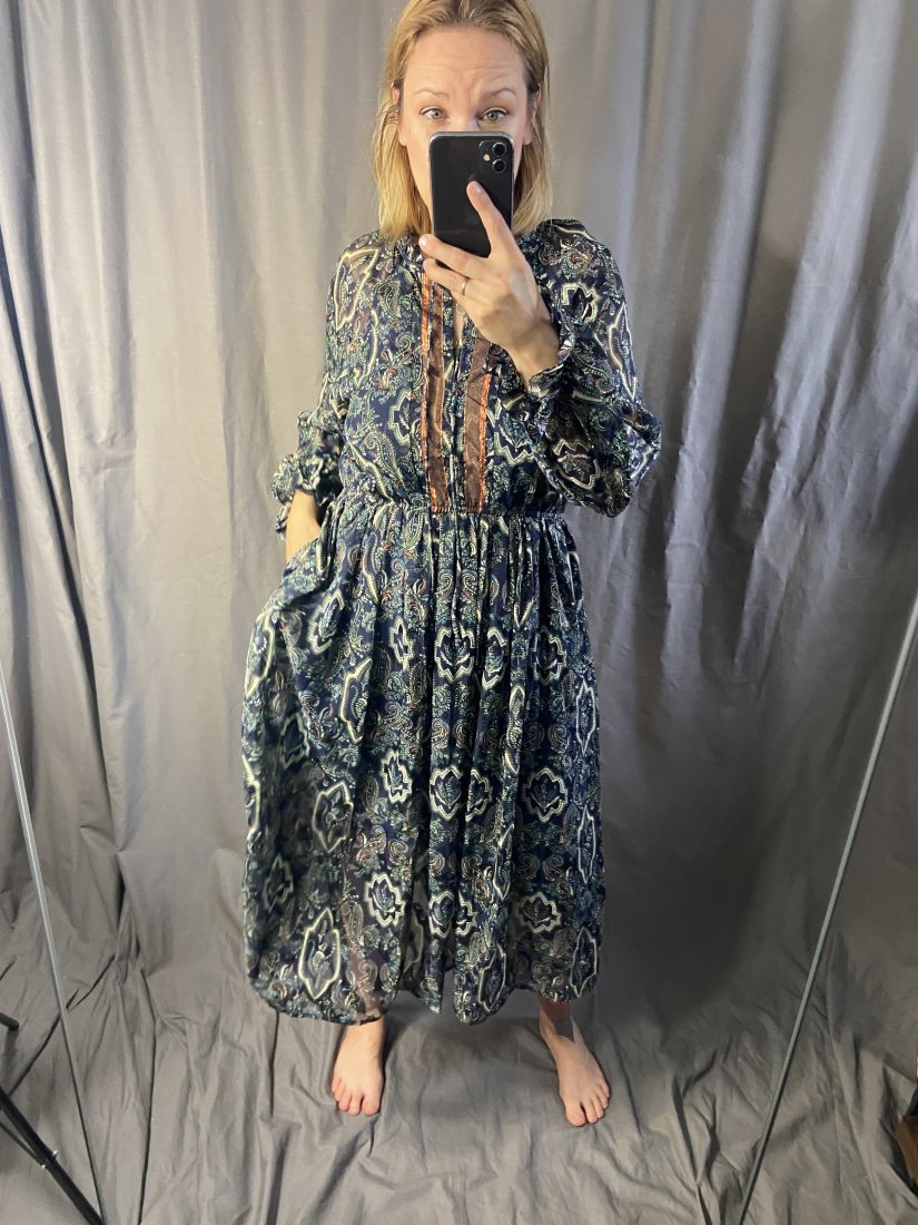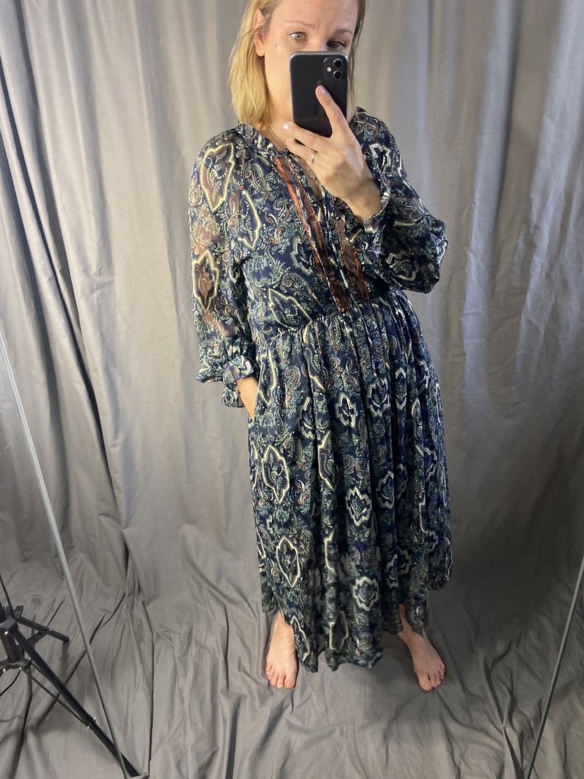 Etno sukienka marki Wiya. Z kieszeniami w biodrach. Dekolt wiązany, wierzch fru fru, posiada elastyczną podszę w w linii ciała.