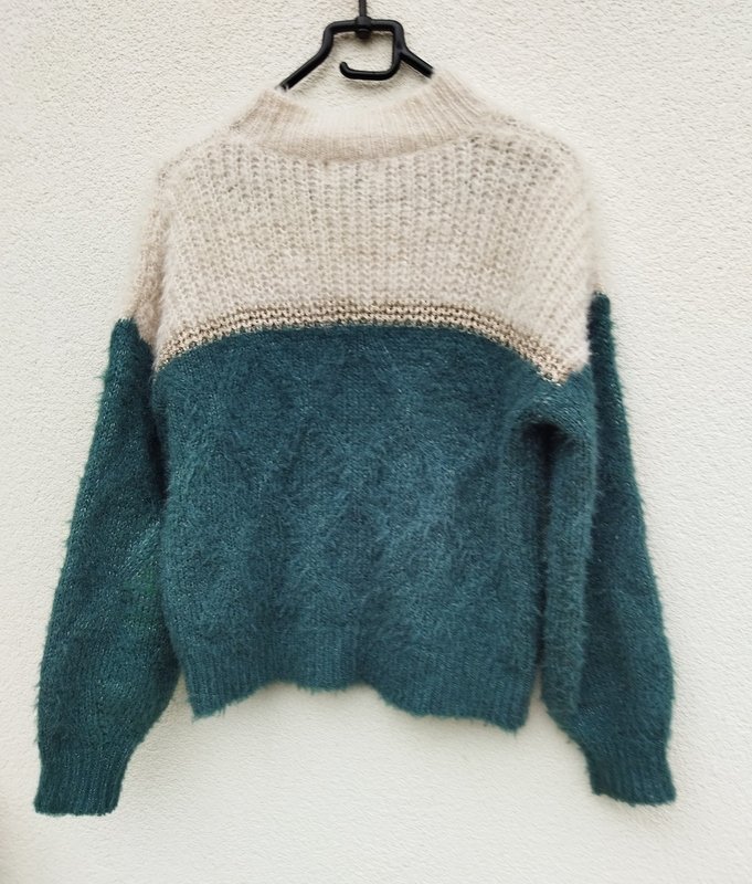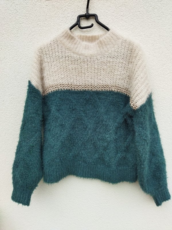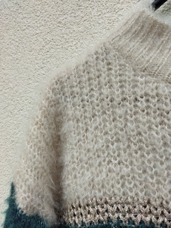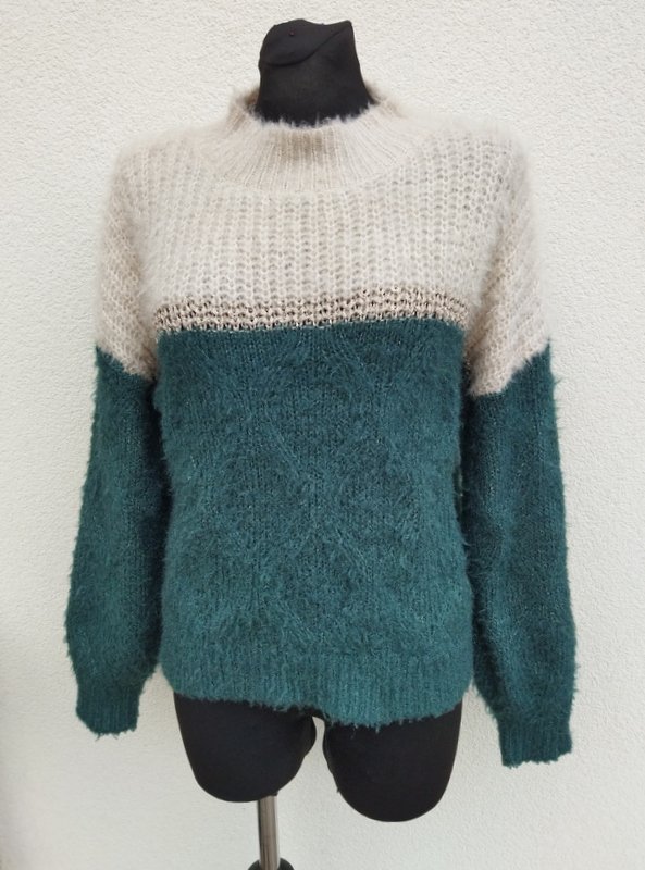 Miły puszysty sweter w kolorystyce jaśniutkiego beżu wpadającego w biel i morskiej zieleni, z dyskretną metaliczna nitką. Z półgolfem . Wykończony ściągaczami.