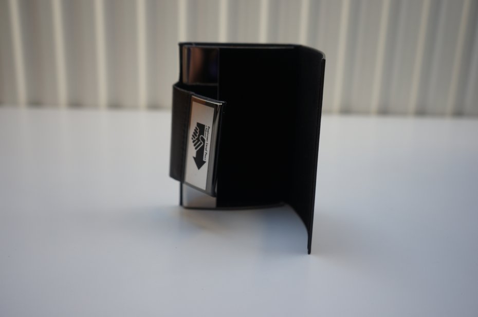 Wizytownik w kolorze czarnym. Magnetyczne zamknięcie zapewnia bezpieczeństwo przechowywanych wizytówek. Wykonany z eco skóry, delikatnego weluru, metalu. Może służyć również jako etui na karty kredytowe. Oryginalnie zapakowany. Nowy. Stan bardzo dobry.