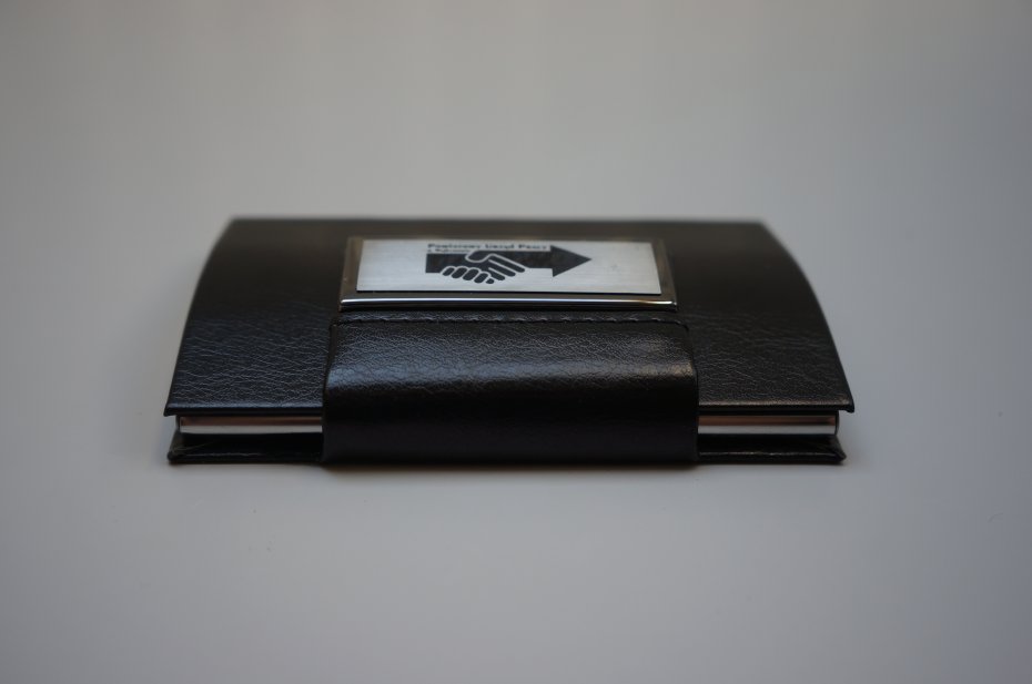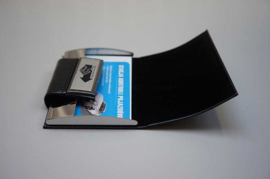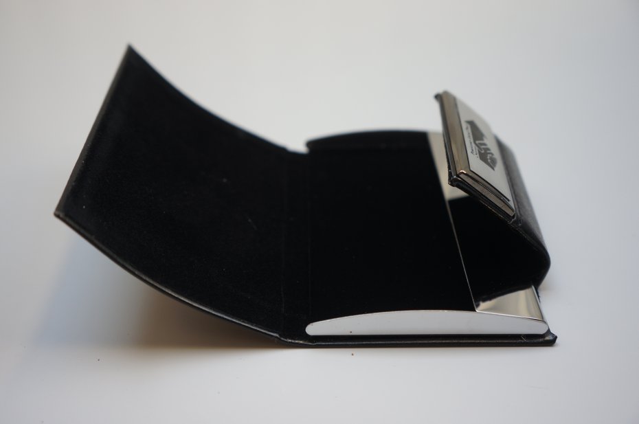 Wizytownik w kolorze czarnym. Magnetyczne zamknięcie zapewnia bezpieczeństwo przechowywanych wizytówek. Wykonany z eco skóry, delikatnego weluru, metalu. Może służyć również jako etui na karty kredytowe. Oryginalnie zapakowany. Nowy. Stan bardzo dobry.