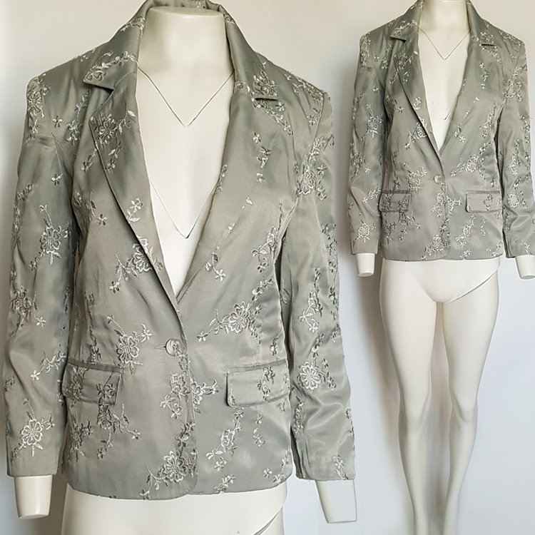 Krótki żakiet marki Together wykonany z subtelnie połyskującej tkaniny w odcieniu seledynowo-szarym. Całość zdobiona haftowanym motywem kwiatowym, który nadaje żakietowi wyjątkowego charakteru. Model o klasycznym kroju z klapami, z długim rękawem, zapinany na guzik. Żakiet posiada dwie kieszenie z przodu (zaszyte od nowości). Wnętrze wykończone podszewką.