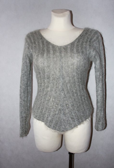 włochaty bardzo oryginalny szary sweterek, przód lekko wydłużony, tył ala frak z rozcięciem, zapięcie w postaci metalowego kołeczka na plecach