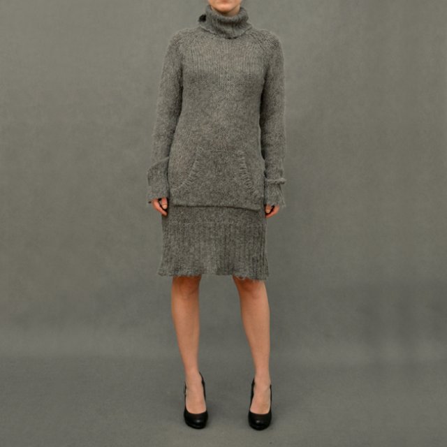 Włochata sukienka z kangurkową kieszonką i golfem. Z długimi włoskami siwymi. Taka w kloszardowym, bardzo modnym stylu.