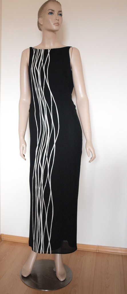 Czarna długa suknia exluzywnej włoskiej marki Marella (grupa Max Mara), na podszewce. Wzór w kolorze ecru, jasny beż. Stan bardzo dobry - (z przodu wystaje rabek podszewki i jasny brzeg na dole odrobinę przybrudzony). Materiał 100% wiskoza. Z tyłu długi zamek, a na dole długie rozcięcie. Rozmiar z metki włoskie 40, czyli nasze 36, ale chyba mniejsza. Podaję wymiary mierzone na płasko;