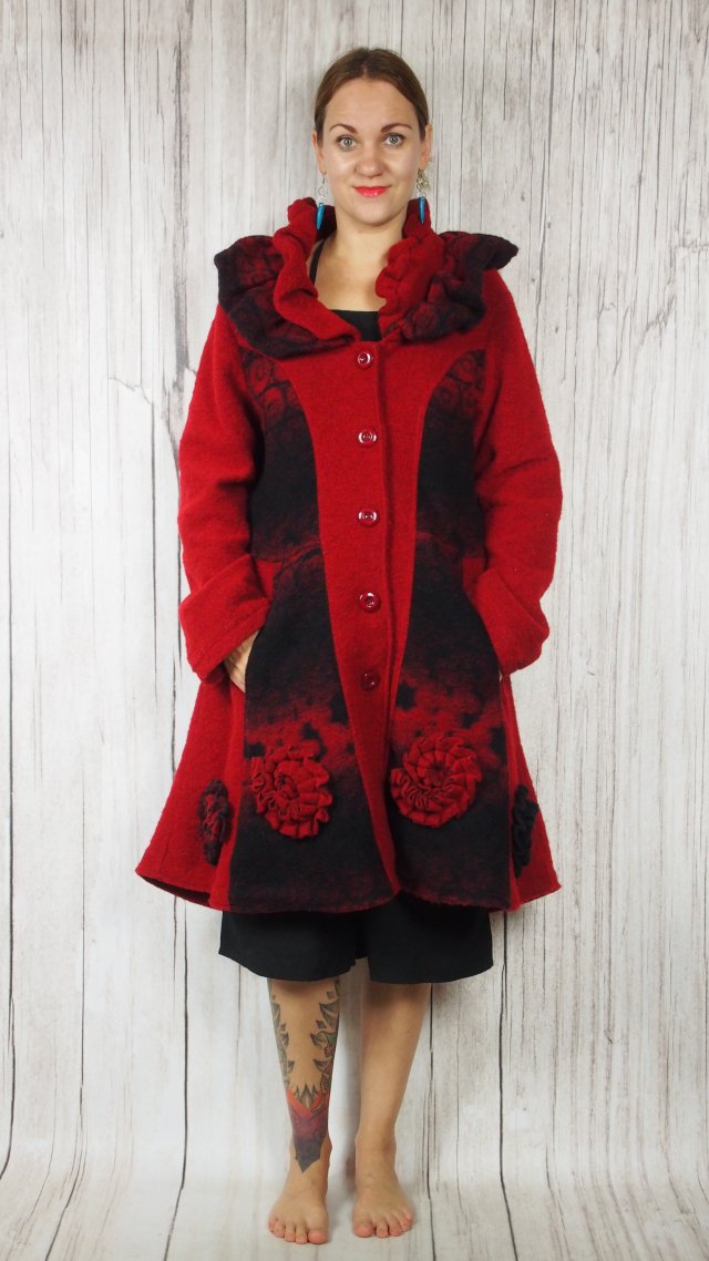 Włoski artystyczny jesienno-zimowy płaszcz na podszewce. Wierzch wełna 80%, akryl 20%.