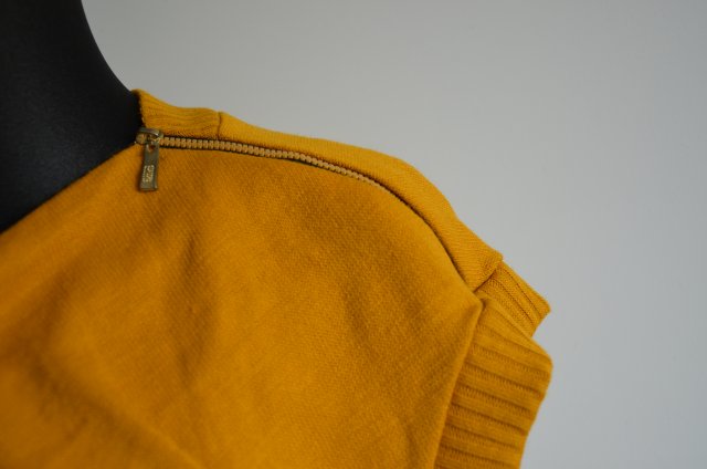 Bardzo modny, włoski sweterek. Stylowy krój. z ozdobnymi zamkami na ramionach. Dekolt luźny, falisty. Krótkie rękawy ze ściągaczami. Dól sweterka również ze ściągaczami. Dwie boczne kieszonki, wywijane.