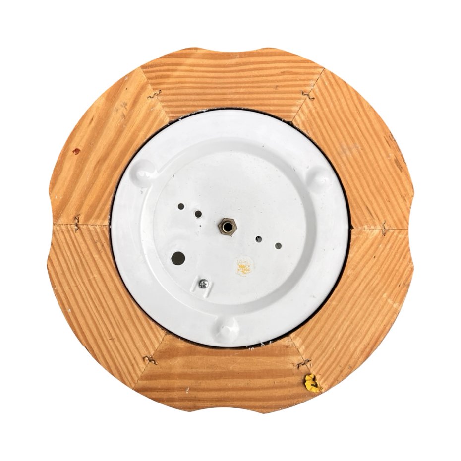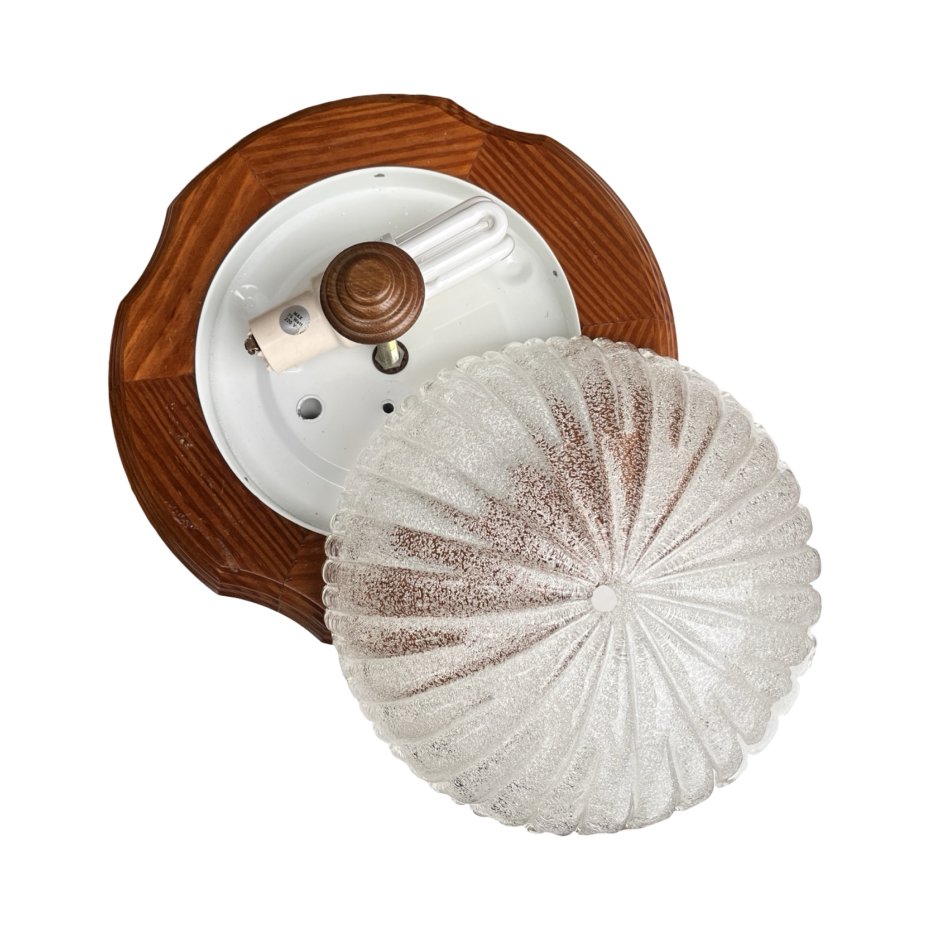 Stylowy plafon włoskiej produkcji z lat 60. XX wieku, wykonany z połączenia drewna i szkła o strukturze lodowej. Szkło ma wyrazistą, żłobioną fakturę, która pięknie rozprasza światło, tworząc ciepły i nastrojowy efekt. Drewniana podstawa o eleganckiej, falistej formie nadaje całości wyrafinowanego charakteru typowego dla włoskiego designu Mid Century Modern.