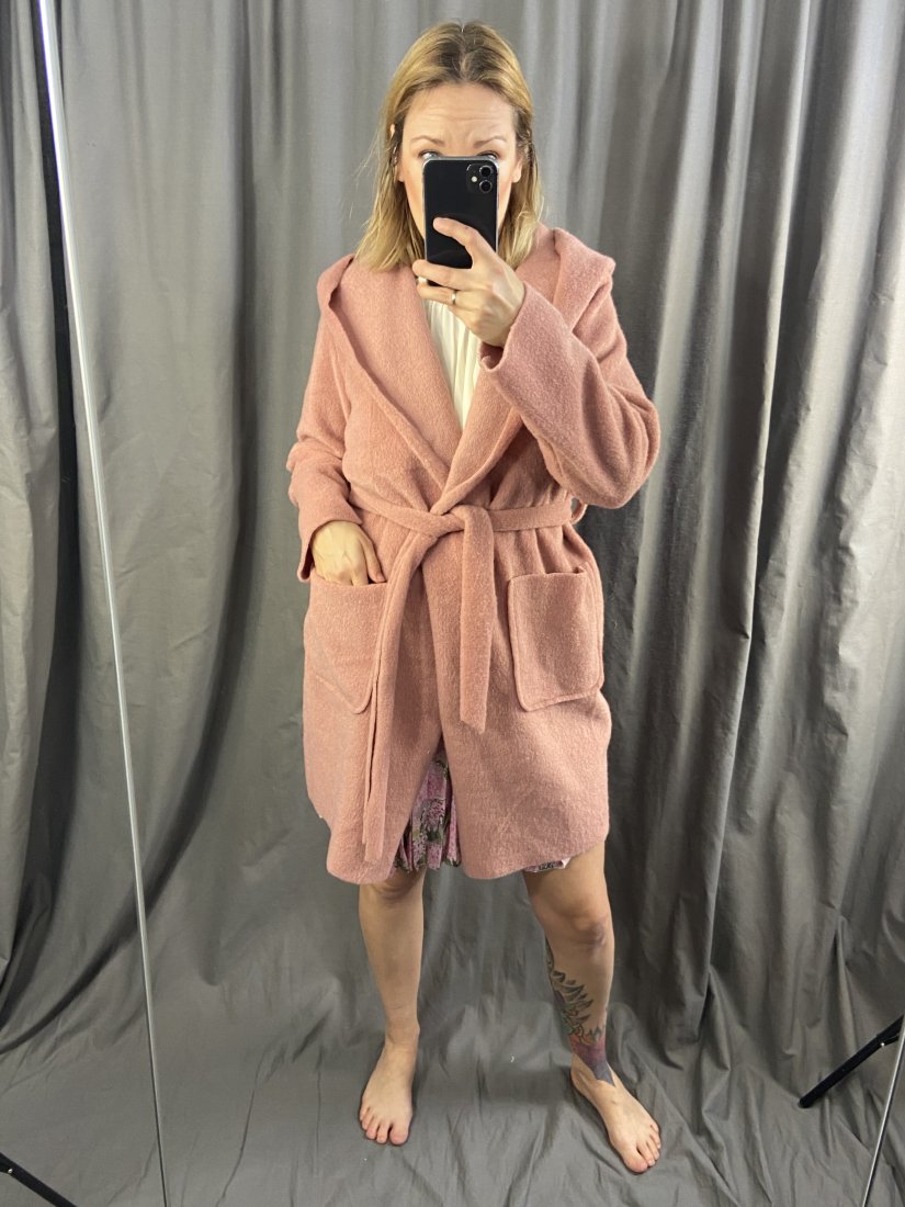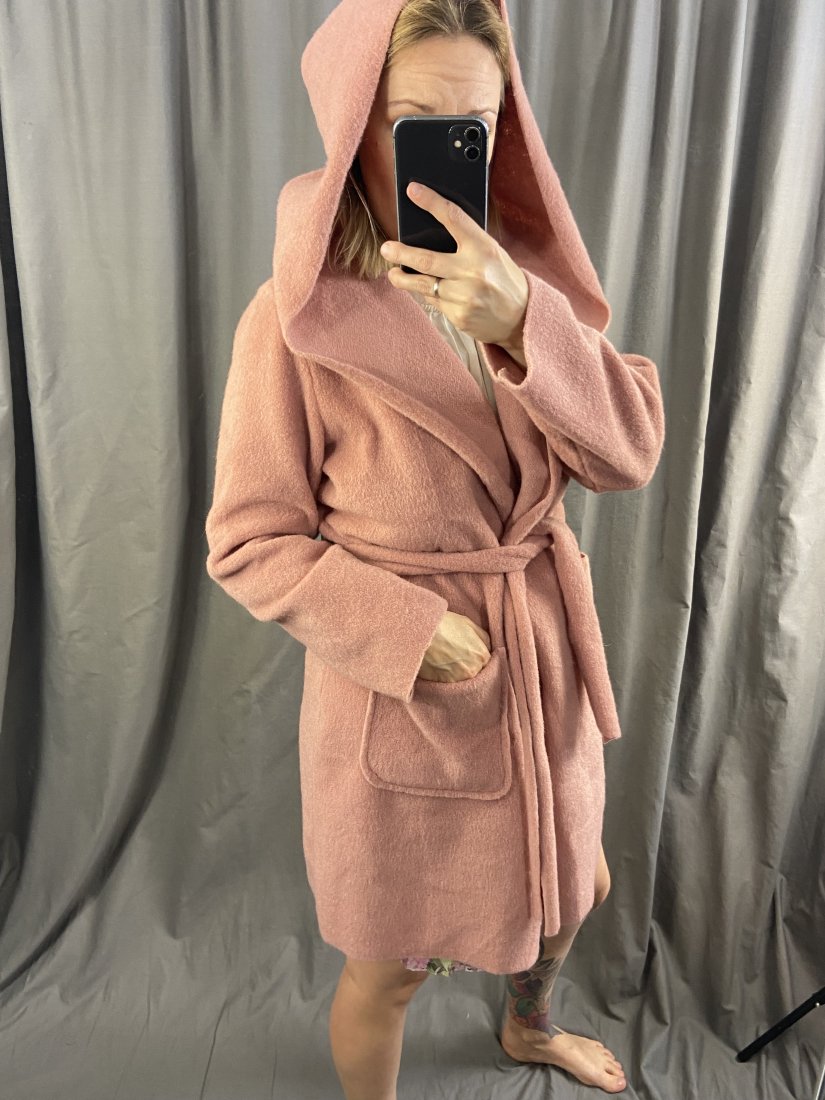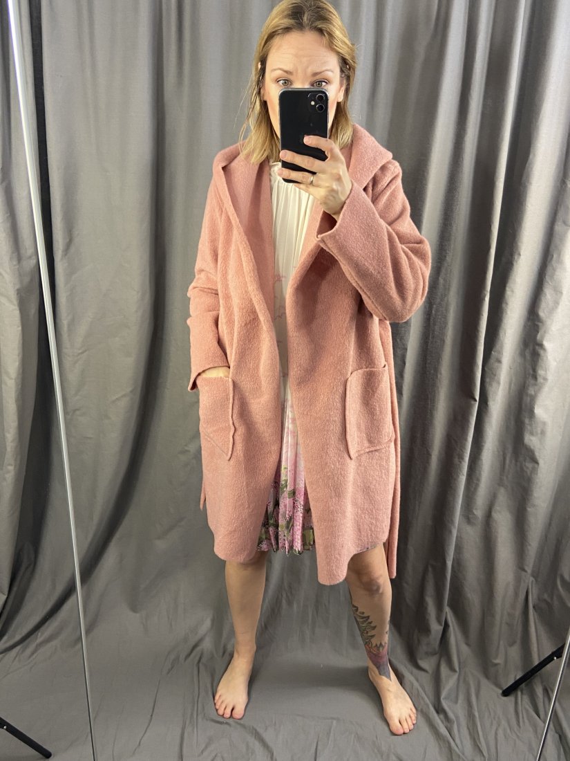 Włoski ocieplany płaszczyk/kardigan z aplaki i poli (10/90%).