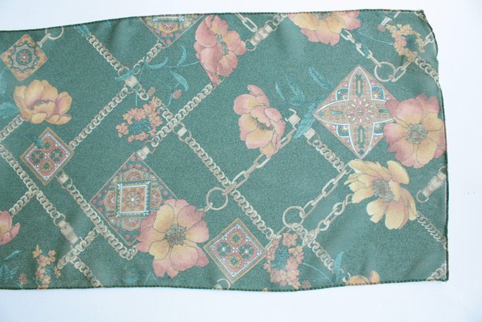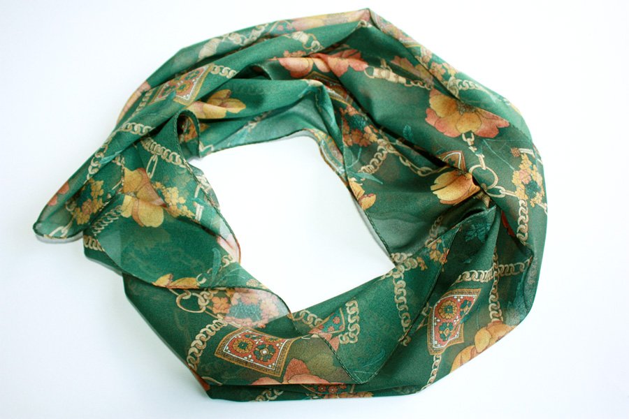 Zwiewny włoski szal w kwiatowe wzory na ciemnozielonym tle.