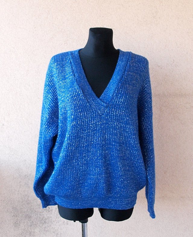 Piękny, włoski sweter marki Gallicia, bardzo lekki. Materiał 30% wełna, 60% akrylu 10% polyamid z dodatkiem srebrnej nitki. Piękny kobaltowy kolor. Rozmiar z metki L, na manekinie o rozmiarze 38. Myślę, że powinien pasować na 42, ale rękaw dosyć długi więc raczej na wysoką osobę. Stan bardzo dobry, jak nieużywany.