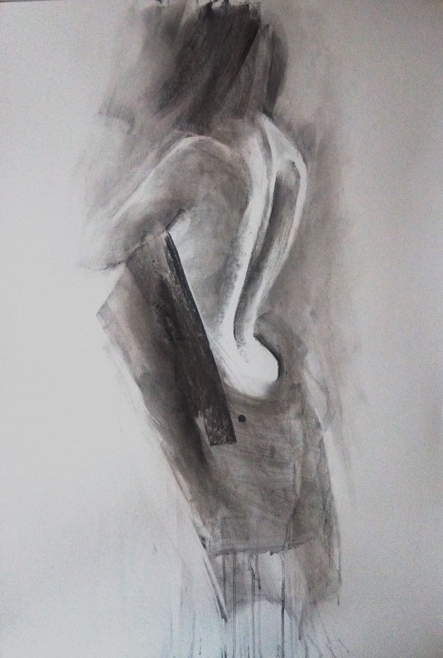 Rysunek autorski w technice węgla na ciepłej bieli brystolu kredowego.