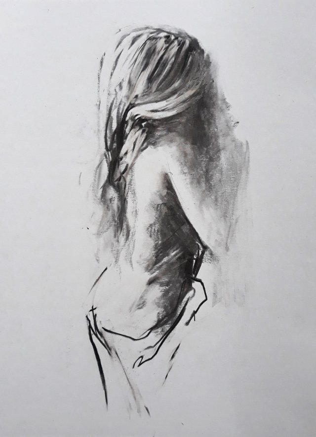 Rysunek autorski w technice węgla i ołówka na brystolu kredowym w tonacji ciepłej bieli.