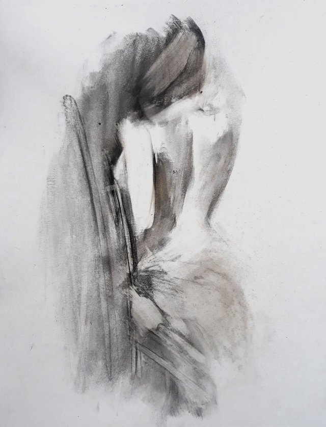 Rysunek w technice węgla na ciełej bieli papieru kredowego o gramaturze 200.