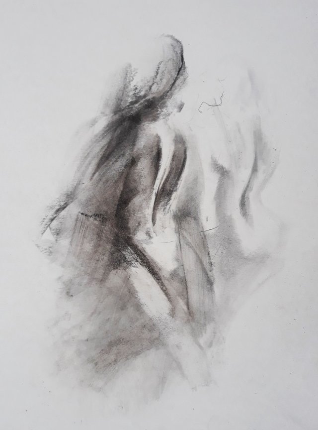 Rysunek w technice węgla na ciełej bieli papieru kredowego o gramaturze 200.