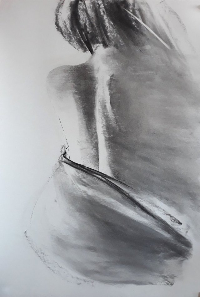 Rysunek w technice węgla na ciepłym tle brystolu kredowego.