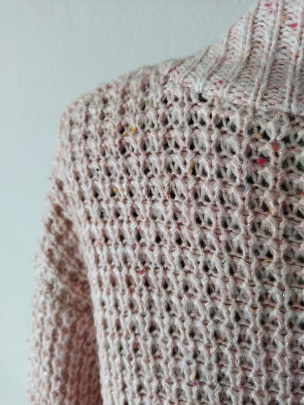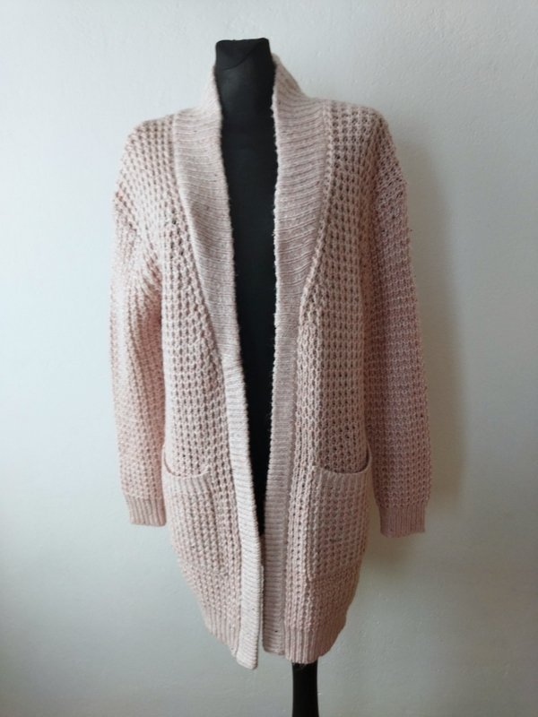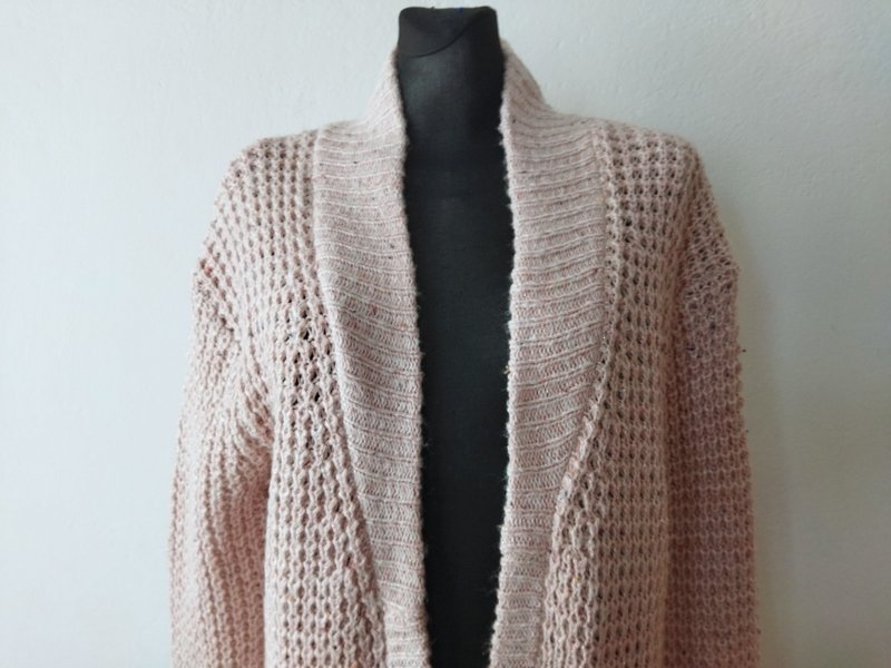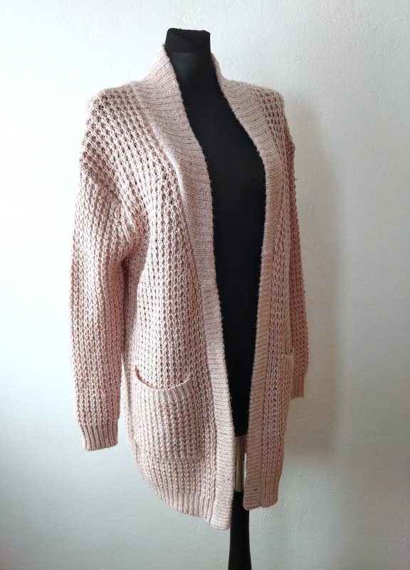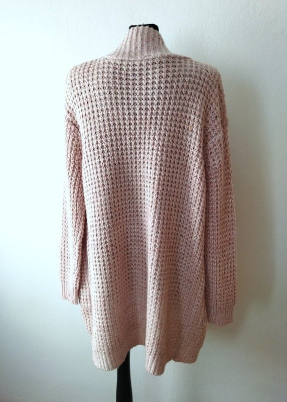 Dłuższy sweter z akrylowej włóczki z domieszką w melanżowej kolorystyce pastelowego różu z bielę i twwedowymi kropeczkami. fason otwarty z z dwiema naszywanymi kieszeniami. Wykończony ściagaczami