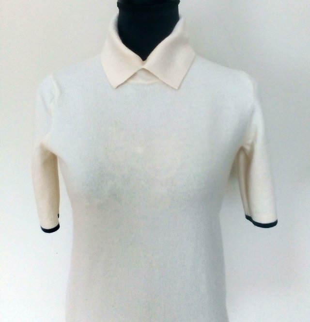 Sweterek z wełny merynosów, kolor ecru, z kołnierzykiem na wysokiej stójce, jakby rozcięty golf, rękaw krótki z czarną lamówką, ściągacz u dołu swetra i przy rękawach