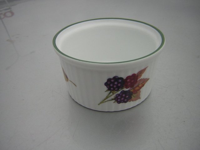 Porcelanowe naczynko na przystawki - sygnowane jakością angielskiej porcelany Royal Worcester. Sygnowane EVESHAM VALE 1986 ROYAL WORCESTER FINE PORCELAIN FREEZER TO OVEN OVEN TO TABLE MICROWAVE PROOF MADE IN ENGLAND 16. 4. Ryflowanie, zielony rant i wzór w dobrym angielskim stylu :) Wykończenie błyszczące, kolory żywe, spód matowo - biskwitowo. Góra 8; dół 7; wysokość 4 cm.Stan zachowania bardzo dobry.