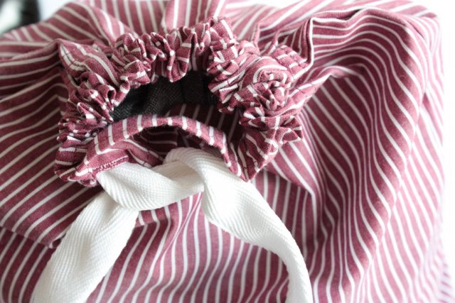 Praktyczny, pojemny woreczek do przechowywania. Bordowy w białe prążki. Świetnie sprawdzi się w podróży, jak również do przechowywania w domu. Na górze ściąganie troczkiem.
