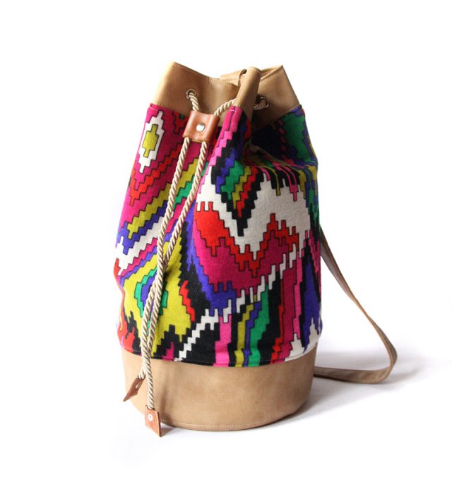Torba-worek na ramię / na skos wykonana z beżowej skóry ekologicznej oraz kolorowej dzianiny. Wewnątrz mocna, granatowa podszewka oraz 2 kieszonki (w tym jedna zamykana na suwak). Plecak ściągany u góry za pomocą grubego sznurka w kolorze beżowym. Wys. 43 cm, dno okrągłe o średnicy 23 cm; pasek regulowany max dł. 90 cm.