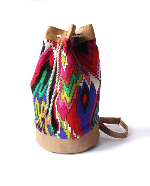 Torba-worek na ramię / na skos wykonana z beżowej skóry ekologicznej oraz kolorowej dzianiny. Wewnątrz mocna, granatowa podszewka oraz 2 kieszonki (w tym jedna zamykana na suwak). Plecak ściągany u góry za pomocą grubego sznurka w kolorze ecru. Wys. 43 cm, dno okrągłe o średnicy 23 cm; pasek regulowany max dł. 107 cm.