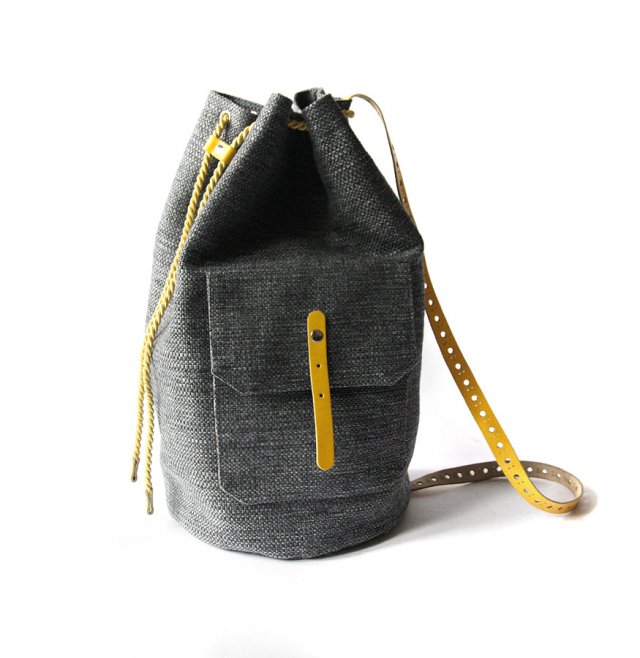 Torba-worek na ramię / na skos wykonana z mocnej tkaniny o wyraźnym splocie (balaton). Z przodu kieszeń zamykana na magnes, ukryty pod klapką. Wewnątrz wzorzysta podszewka oraz kieszeń zamykana na suwak. Plecak ściągany u góry za pomocą grubego sznurka w kolorze żółtym. Wys. 42 cm, dno okrągłe o średnicy 23 cm; pasek ażurowy dł. 76 cm.