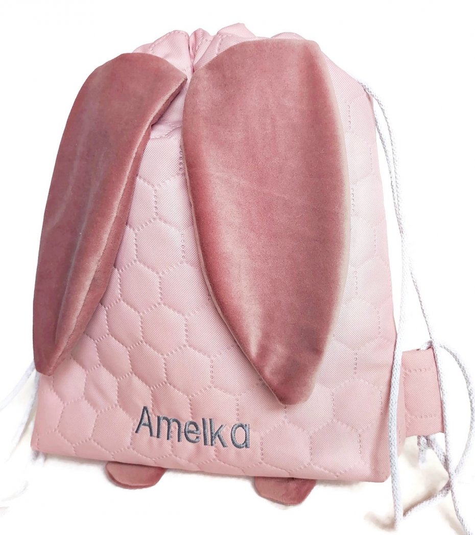 Różowy worek, uszy uszyte z milutkiego materiału, w środku kolorowa podszewka,