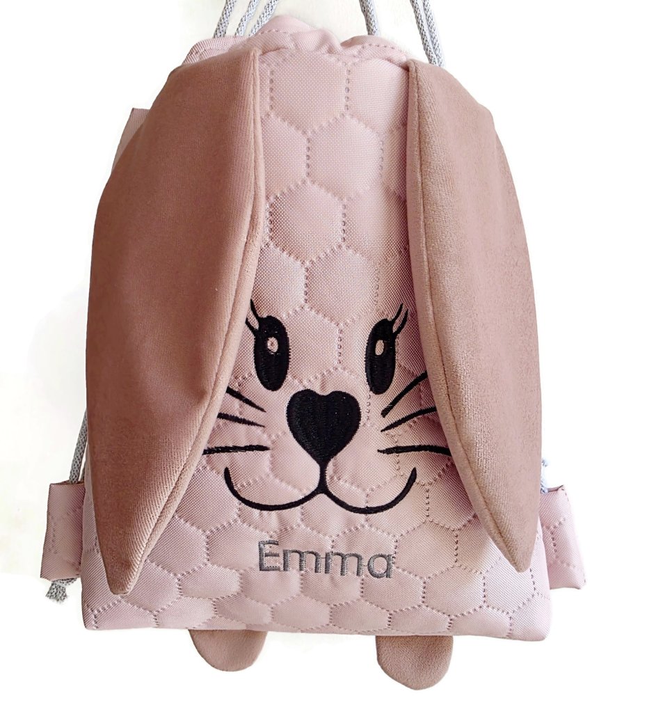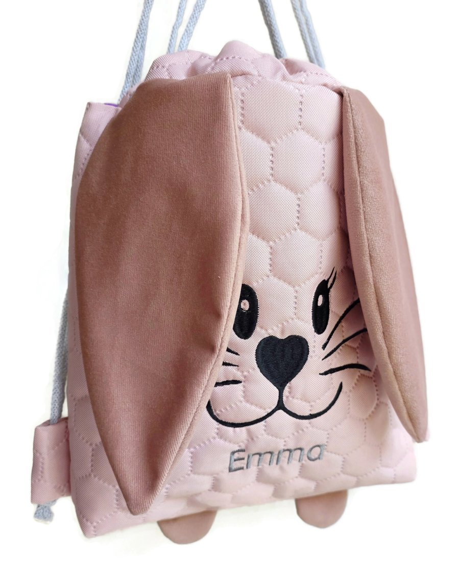 Różowy worek, uszy uszyte z milutkiego materiału, w środku kolorowa podszewka,