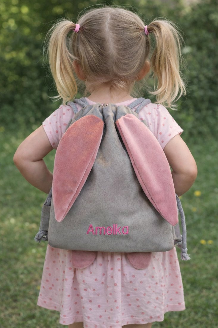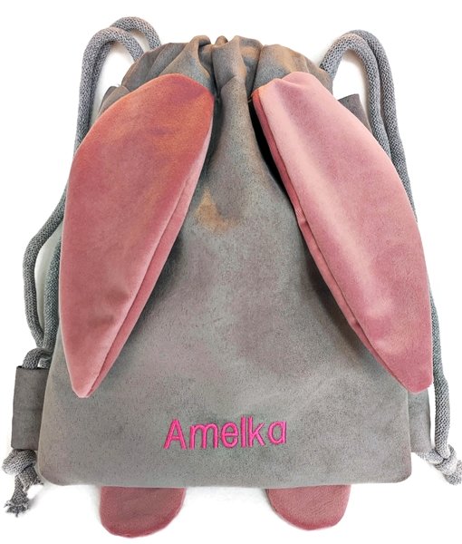 Worek wykonany z szarego ekozamszu, uszy uszyte z milutkiego materiału, w środku kolorowa podszewka,