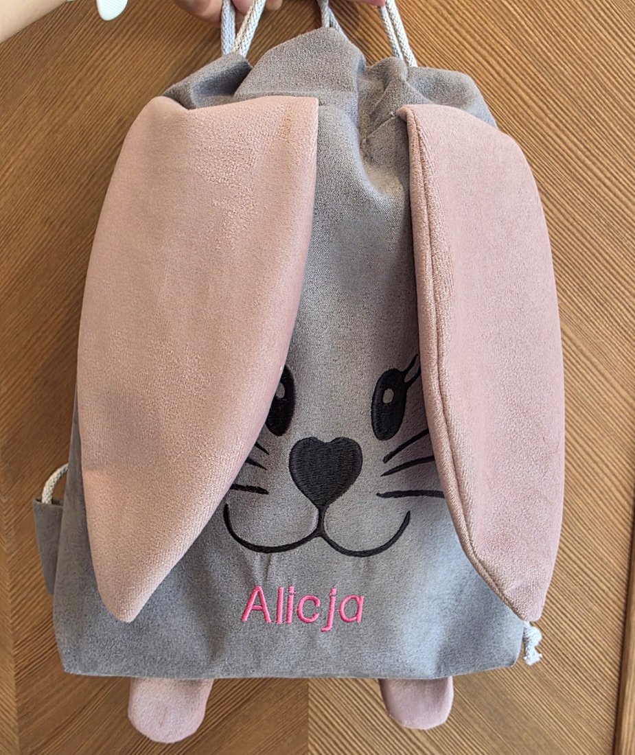 Różowy worek, uszy uszyte z milutkiego materiału, w środku kolorowa podszewka,